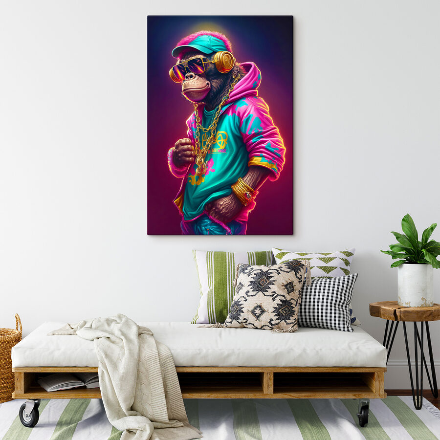 Sieh dir diesen coolen Leinwanddruck an: ein super stylisches Äffchen mit Hut und Sonnenbrille, das alle Chill-Vibes in sich trägt. Perfekt für alle, die auf schrullige und lustige Dekoration stehen. Stellen Sie sich dieses farbenfrohe und flippige Bild an Ihrer Wand vor – es ist, als wäre Ihr Raum plötzlich viel interessanter und verspielter geworden. Die Details sind lebhaft, mit Aquarellfarben in Pink und Teal, und es hat einfach etwas so wunderliches, fesselndes an sich. Sie werden wahrscheinlich lächeln, wann immer Sie einen Blick darauf werfen. Dieser coole Affe bringt ein bisschen frechen Charme und Charakter in Ihr Zimmer, egal ob es sich um Ihr Wohnzimmer, Ihr Büro oder sogar Ihr Kinderzimmer handelt. Er sprengt einfach die Norm und verleiht Ihren Wänden einen Hauch von Persönlichkeit. Wer hätte gedacht, dass ein Affe so gut aussehen kann, oder?
