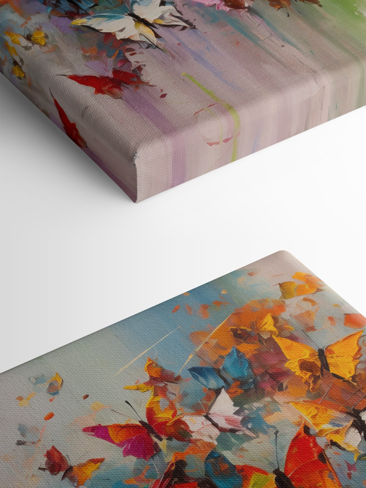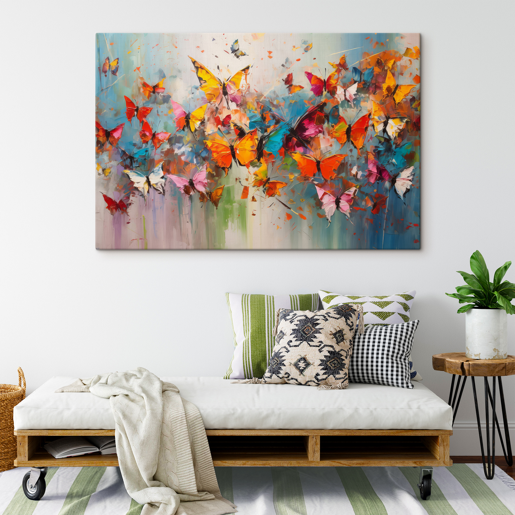 Verwandeln Sie jeden Raum mit diesem farbenfrohen Leinwandbild “Gruppe fliegender Schmetterlinge”. Es ist wie ein Ausbruch von Freude an Ihrer Wand, mit farbenfrohen Schmetterlingen, die in einem skurrilen Tanz herumfliegen. Stellen Sie sich vor, wie das Sonnenlicht hereinströmt und verspielte Schatten wirft, während diese Schönheiten fliegen und den Zauber der Natur ins Haus holen. Perfekt für eine gemütliche Leseecke oder ein lebhaftes Wohnzimmer, wärmt dieses Stück nicht nur die Wände, sondern regt auch zu Gesprächen an. Freunde werden hereinspazieren, einen Blick darauf werfen und sofort die fröhliche Stimmung spüren. Wer möchte nicht, dass eine flatternde Farbexplosion Leben in sein Heim bringt? Lassen Sie sich von diesem Bild Geschichten über die Wunder der Natur erzählen – ein wahrer Fluchtpunkt in Ihrem Zuhause.