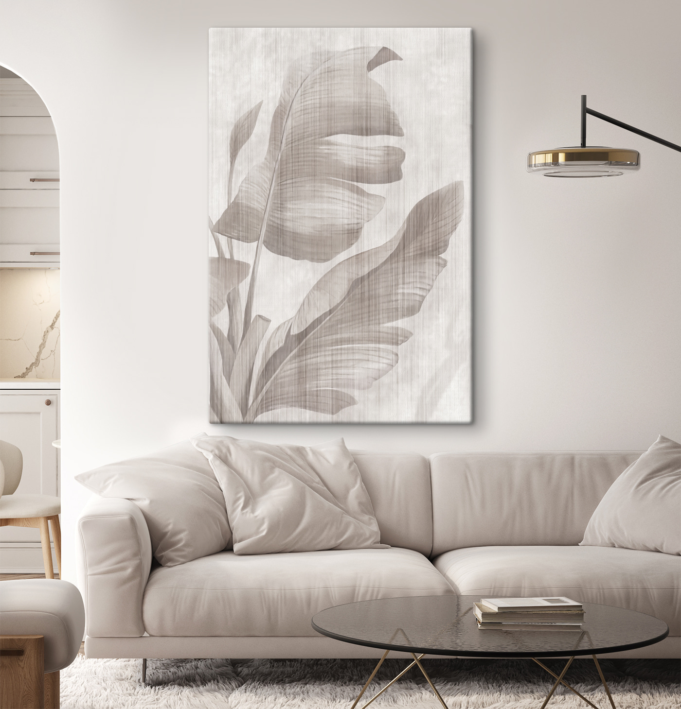 Verwandeln Sie Ihren Raum mit diesem atemberaubenden monochromen tropischen Blattmuster auf Leinwand. Es bringt einen Hauch von Wildnis ins Haus, ohne die lästigen Insekten. Stellen Sie sich vor, dass dieses Bild über einer gemütlichen Couch oder in einem hellen Flur hängt und den ganzen Raum sofort in seinen Bann zieht. Die subtilen Schattierungen schaffen eine ruhige Atmosphäre, die perfekt ist, um sich nach einem langen Tag zu entspannen. Freunde und Familie werden sich von der kühlen Eleganz angezogen fühlen und sich über ihre eigenen Lieblingsplätze im Grünen unterhalten. Ein bisschen Grün kann viel bewirken – nur eben auf eine schicke, stilvolle Art!