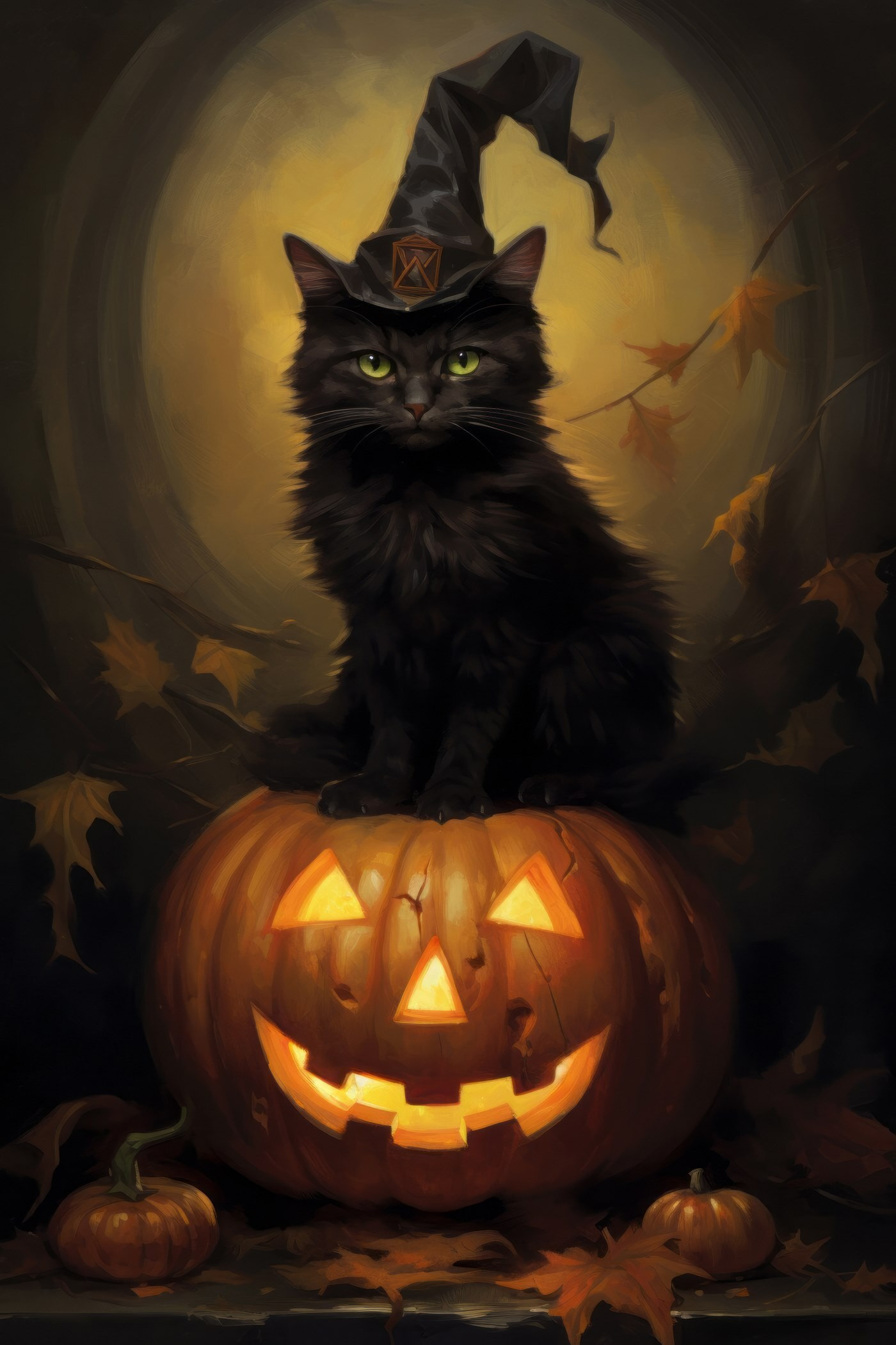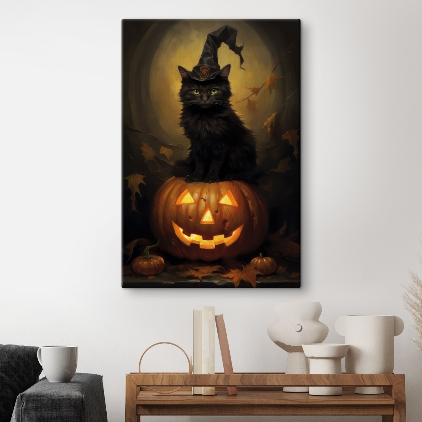 Dieser skurrile Leinwanddruck mit einer Katze, die majestätisch auf einem leuchtenden Kürbis thront, verleiht jedem Raum einen Hauch von Magie und Laune. Stellen Sie sich vor, wie diese schlaue Katze, die sich vielleicht für den König von Halloween hält, einen charmanten Zauber über Ihren Wohnbereich ausübt. Das warme Leuchten des Kürbisses, gepaart mit dem wachsamen Blick der Katze, schafft eine gemütliche, bezaubernde Atmosphäre. Perfekt für Tierliebhaber oder alle, die einen Hauch von Humor und Unfug in ihrer Einrichtung zu schätzen wissen. Ein Gesprächsanlass, ganz sicher!