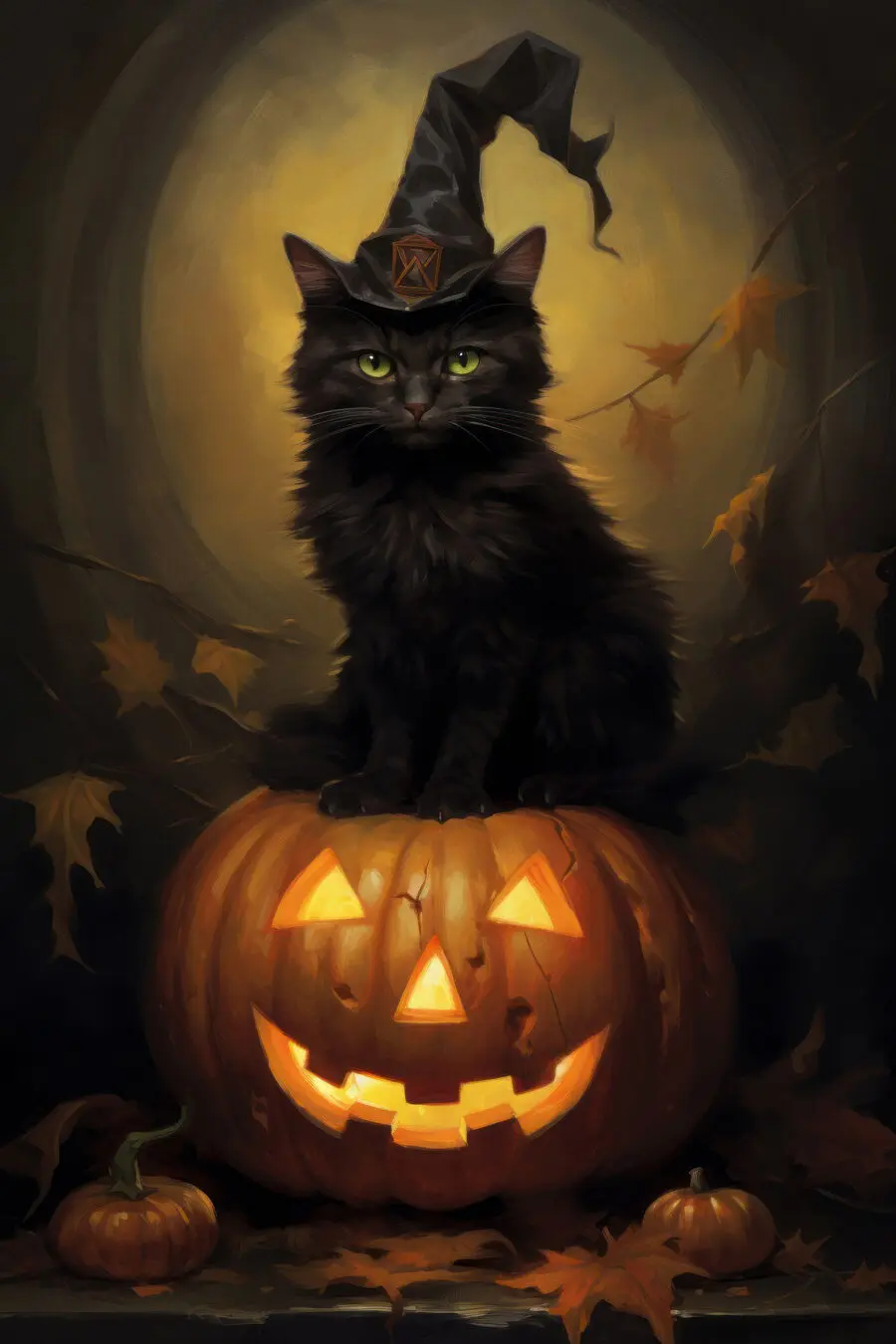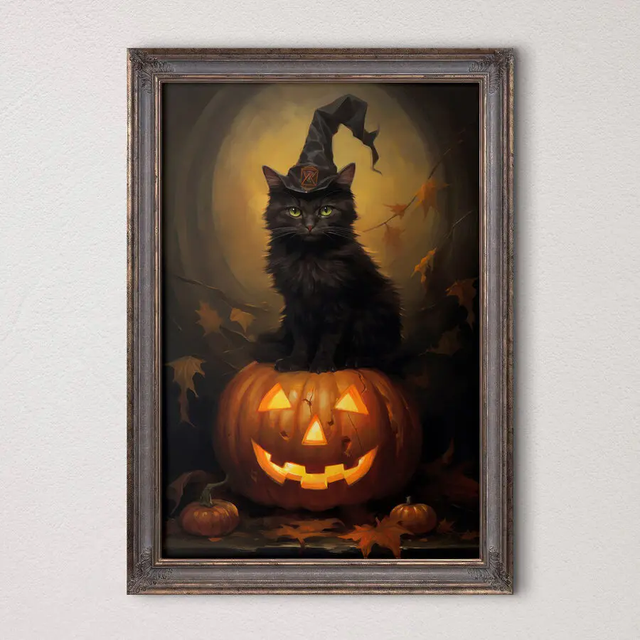 Dieser skurrile Leinwanddruck mit einer Katze, die majestätisch auf einem leuchtenden Kürbis thront, verleiht jedem Raum einen Hauch von Magie und Laune. Stellen Sie sich vor, wie diese schlaue Katze, die sich vielleicht für den König von Halloween hält, einen charmanten Zauber über Ihren Wohnbereich ausübt. Das warme Leuchten des Kürbisses, gepaart mit dem wachsamen Blick der Katze, schafft eine gemütliche, bezaubernde Atmosphäre. Perfekt für Tierliebhaber oder alle, die einen Hauch von Humor und Unfug in ihrer Einrichtung zu schätzen wissen. Ein Gesprächsanlass, ganz sicher!