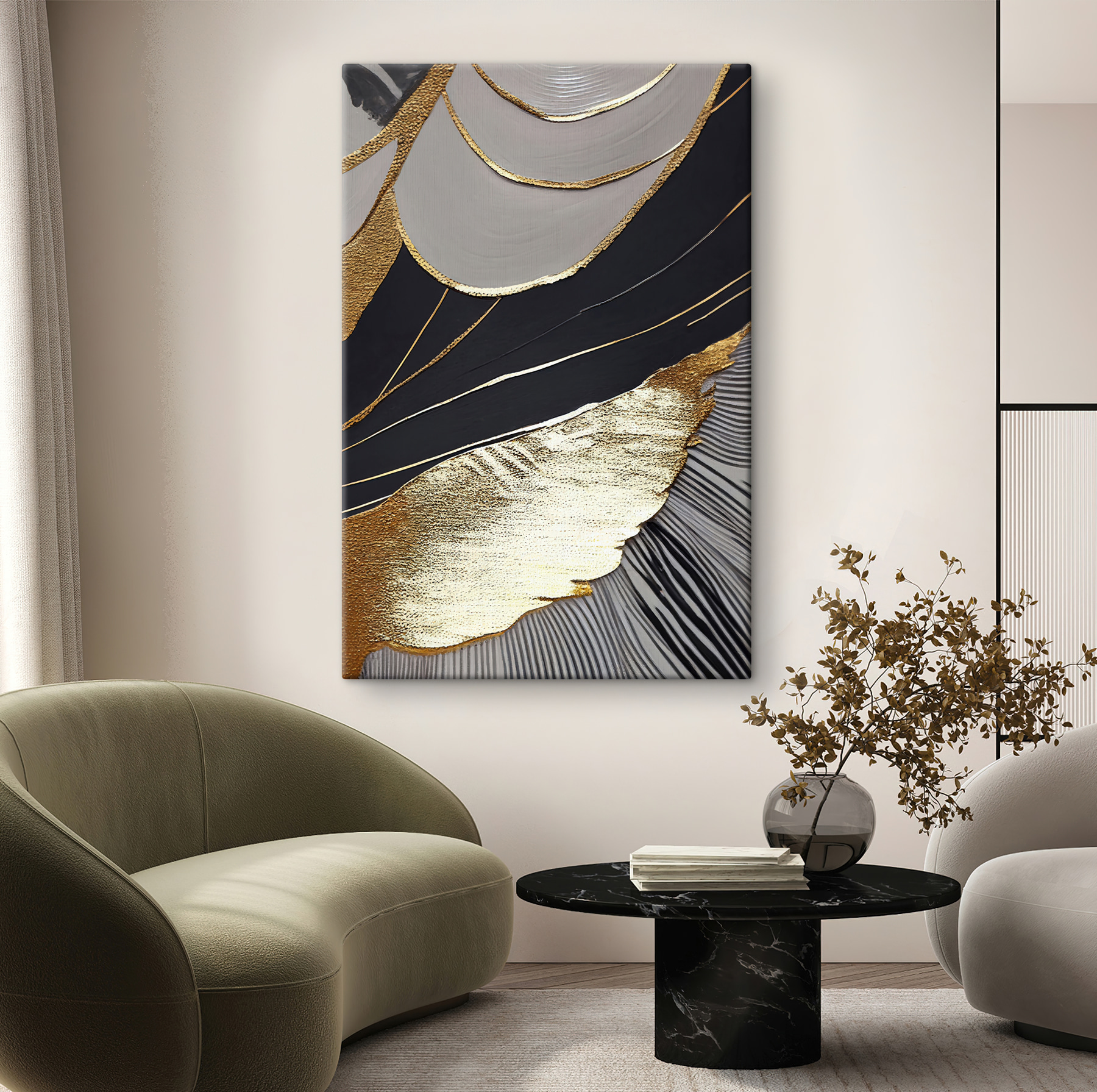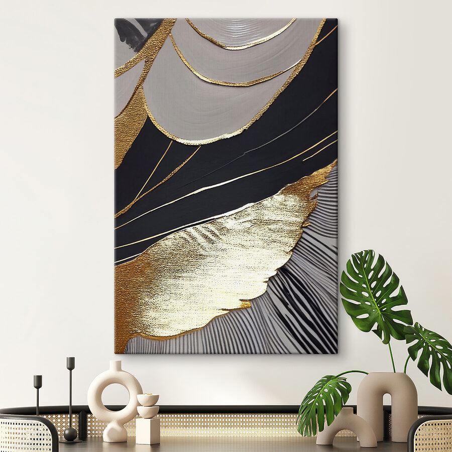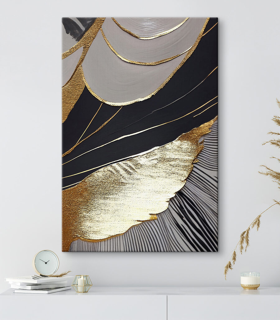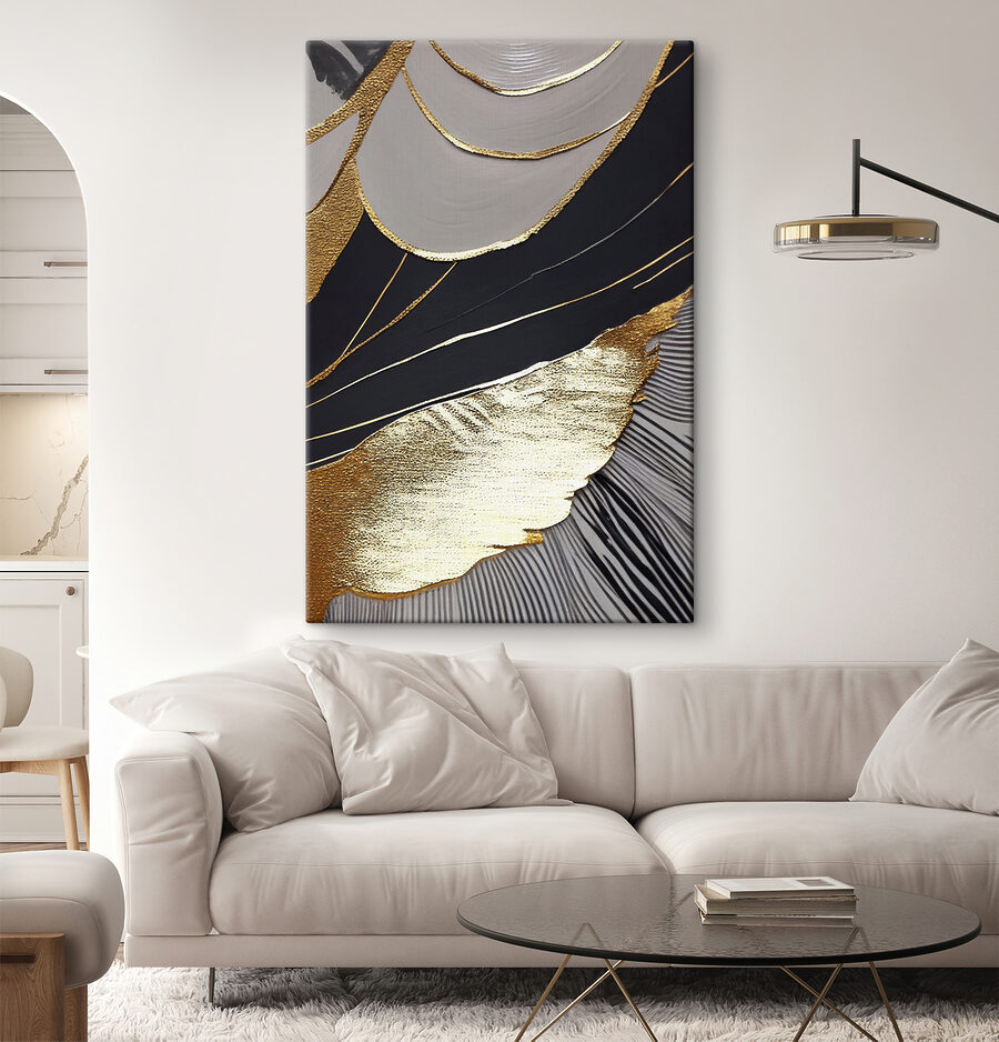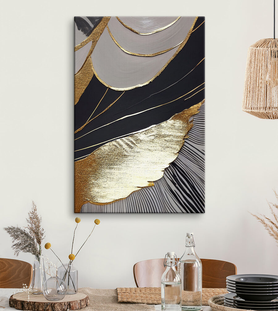 Verändern Sie Ihren Raum mit diesem fesselnden Leinwanddruck mit abstrakten schwarzen und metallischen Mustern. Es ist, als ob Sie sich ein modernes Kunstwerk in Ihr Wohnzimmer holen würden – ganz ohne aufwendige Galeriebesuche. Stellen Sie sich vor, wie dieses auffällige Kunstwerk Ihren Lieblingsraum schmückt und bei zwanglosen Zusammenkünften zu interessanten Gesprächen anregt. Das kühne Design zieht die Blicke auf sich und fügt sich nahtlos in verschiedene Einrichtungsstile ein – egal ob gemütlich oder schick. Stellen Sie sich einen ruhigen Abend vor, nur Sie und die hypnotisierenden Muster, die sich in Gedanken verlieren. Es ist Kunst, die sich lebendig anfühlt und jeden Blick zu einem kleinen Moment der Freude macht.