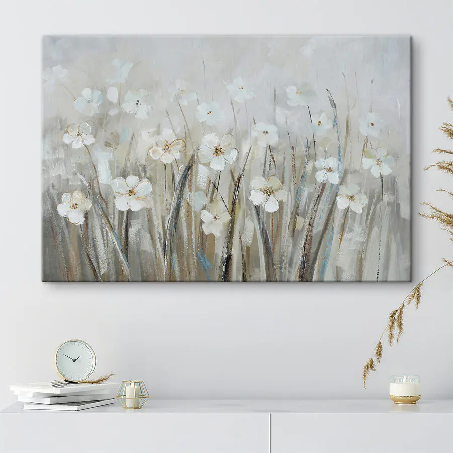 Stell dir vor, du betrittst einen Raum und spürst sofort eine sanfte Brise der Ruhe. Genau das ist es, was diese Leinwand bewirkt! “Painting of White Flowers” schafft mit seinen zarten Blüten und gedämpften Tönen eine sanfte, verträumte Atmosphäre. Es ist wie eine friedliche Wiese, die auf Leinwand festgehalten wurde – perfekt für Ihr Wohnzimmer, Ihr Schlafzimmer oder sogar eine gemütliche Leseecke.