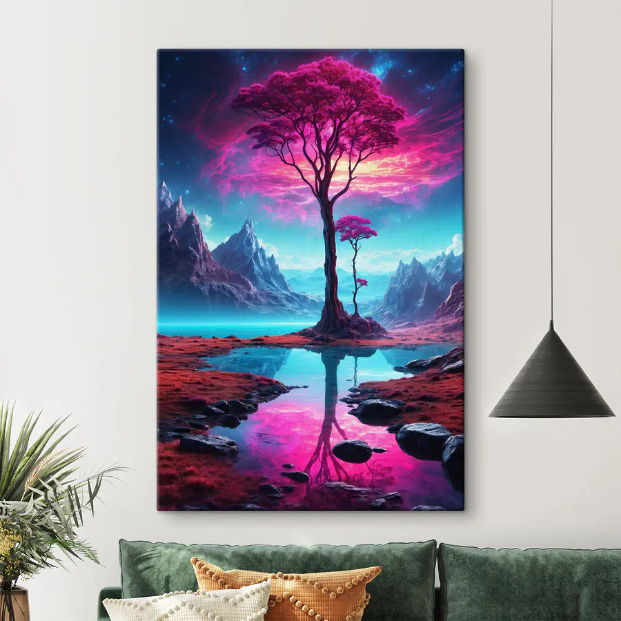 Dieser atemberaubende Leinwanddruck “Tree with a Pink Flower Growing on It” ist pure Magie für Ihre Wände. Es ist, als würde man in einen Traum eintauchen, oder? Sie haben diesen majestätischen Baum mit leuchtend rosa Blüten – es ist fast so, als könnten Sie die Süße in der Luft riechen. Stellen Sie sich vor, dass dieses Bild in Ihrem Wohnzimmer hängt; jedes Mal, wenn Sie hinüberschauen, werden Sie in diese skurrile, weltfremde Landschaft versetzt. Die leuchtenden Farben und die ruhige Szene verleihen Ihrem Raum einen Hauch von Natur und eine Dosis Ruhe. Perfekt für alle, die einen Hauch von lebendiger Schönheit mit der Ruhe der Natur verbinden möchten. Außerdem ist es so faszinierend, dass Ihre Gäste immer wieder fragen werden, woher Sie es haben. Es ist mehr als nur Wandkunst – es ist ein Erlebnis.