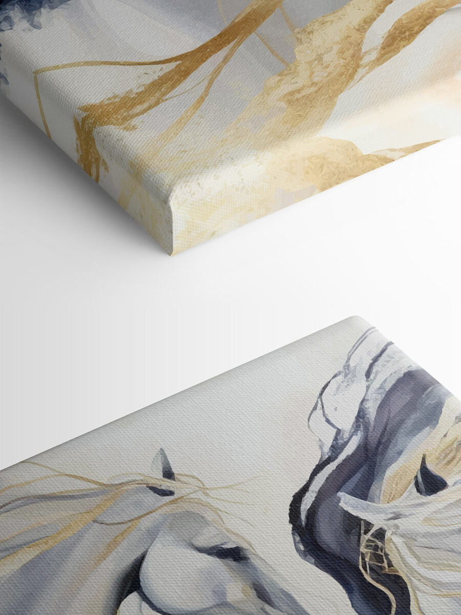 Bringen Sie einen Hauch von Dramatik und Eleganz in Ihren Raum mit dem Leinwanddruck “Majestic Horses in Ethereal Motion”. Stellen Sie sich diese anmutigen Kreaturen vor, wie sie frei galoppieren und ihre wehenden Mähnen wie sanfte Wellen in einer Meeresbrise wirbeln. Dieses Kunstwerk ist perfekt für Tierliebhaber und kann zu Gesprächen anregen oder einfach als atemberaubende Kulisse dienen, wenn Sie sich entspannen wollen. Hängen Sie es in Ihrem Wohnbereich oder einer gemütlichen Ecke auf, und beobachten Sie, wie es die Atmosphäre verändert. Es ist, als ob Sie ein Stück Wildnis in Ihr Zuhause einladen und Ihrer Einrichtung einen dynamischen Touch verleihen, der Ihre Gäste in Erstaunen versetzen wird.