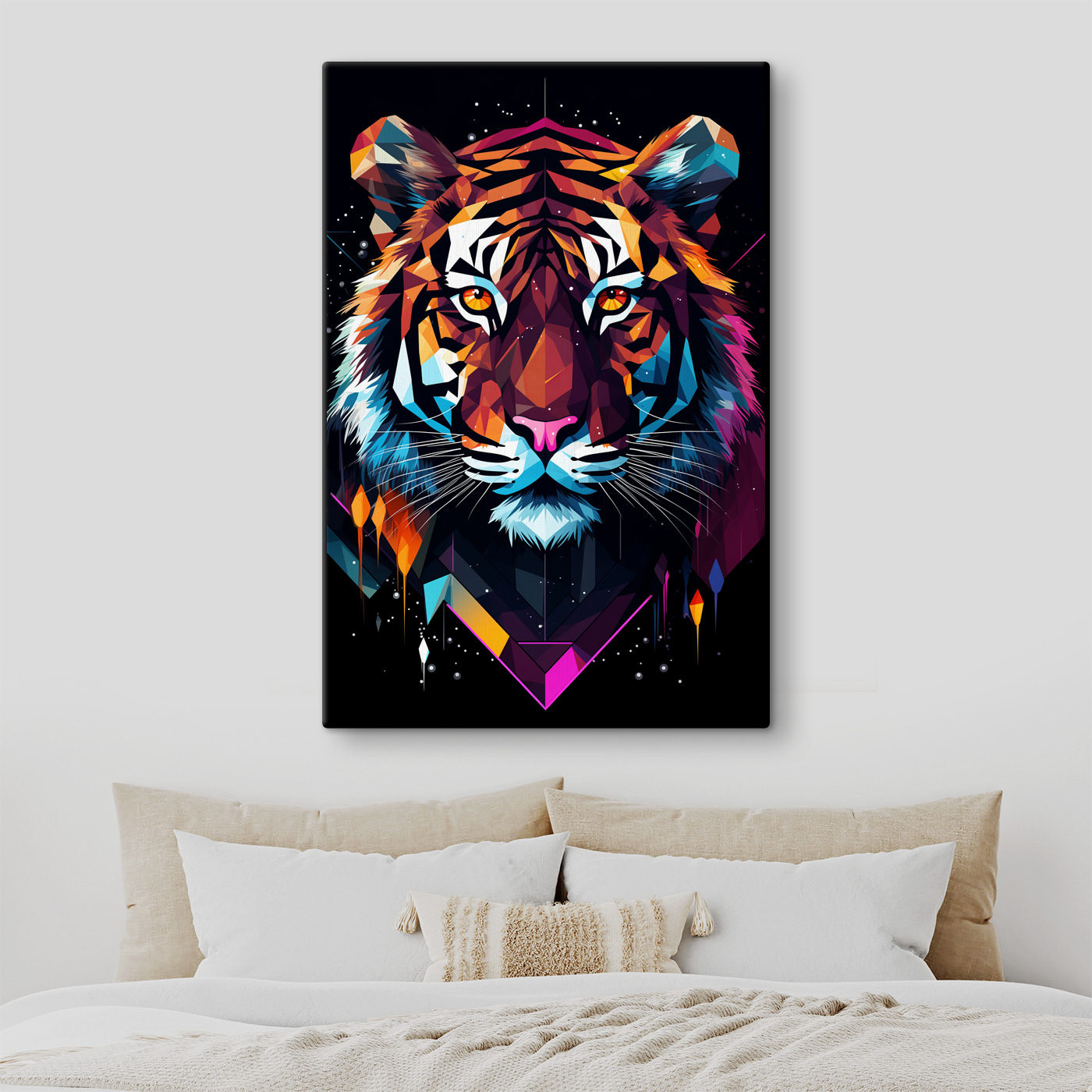 Hängen Sie es in Ihr Wohnzimmer, Schlafzimmer oder sogar in Ihr Büro und lassen Sie die Schattierungen von Orange, Blau und Rosa jede Wand beleben. Betrachten Sie ihn als Ihren persönlichen Wachtiger mit einem Hauch von Neonlicht. Jeder Blick darauf wird Ihnen einen kleinen Freudensprung und einen leichten Schauer über den Rücken jagen… auf eine gute Art und Weise, versteht sich. Es ist mehr als nur Kunst – es ist ein Gesprächsanlass, ein sofortiger Stimmungsaufheller und das perfekte Stück für jeden, der ein bisschen wild im Herzen ist. Also los, bringen Sie einen Hauch ungezähmter Schönheit in Ihr Zuhause!