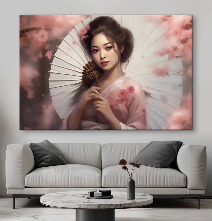 Stellen Sie sich vor, Sie betreten einen Raum und werden von der heiteren Schönheit einer Frau mit einem Sonnenschirm, umgeben von zarten Blüten, begrüßt. Dieser Leinwanddruck fängt einen Moment ein, der an Frühlingsnachmittage und sanfte Brisen erinnert. Es ist wie eine kleine Flucht in einen japanischen Garten direkt in Ihrem Zuhause. Stellen Sie es sich über einer gemütlichen Leseecke oder als Blickfang im Wohnzimmer vor und träumen Sie von ruhigen Landschaften. Die sanften Farben und anmutigen Linien laden zur Wärme ein, so dass es sich wie ein alter Freund anfühlt. Perfekt für alle, die einen Hauch von Eleganz und ein wenig Laune zu schätzen wissen. Es ist nicht nur Kunst, es ist eine Stimmung, eine nette kleine Erinnerung daran, das Leben zu entschleunigen und die sanften Momente zu genießen.