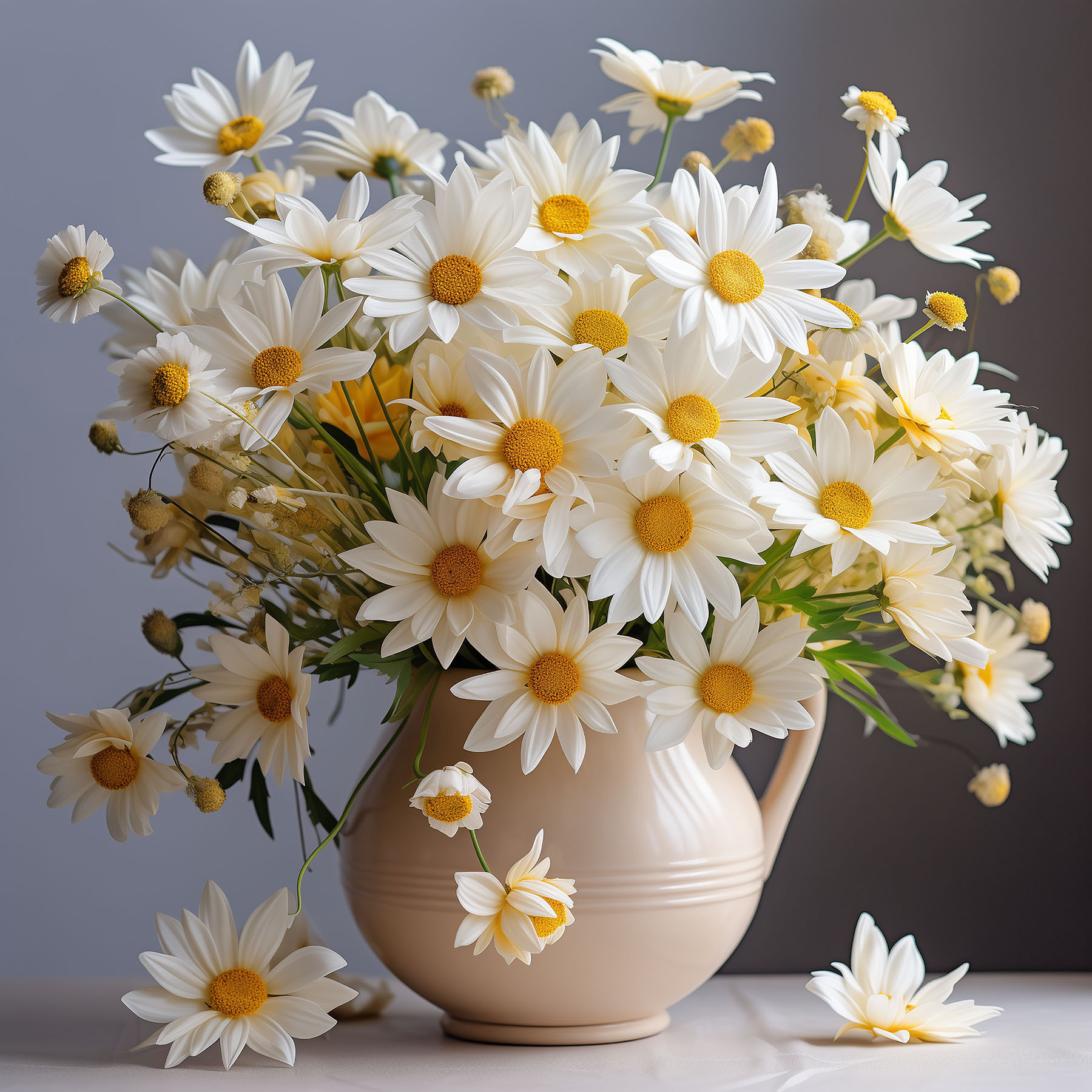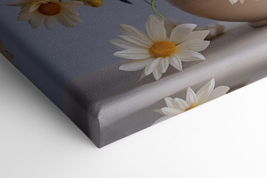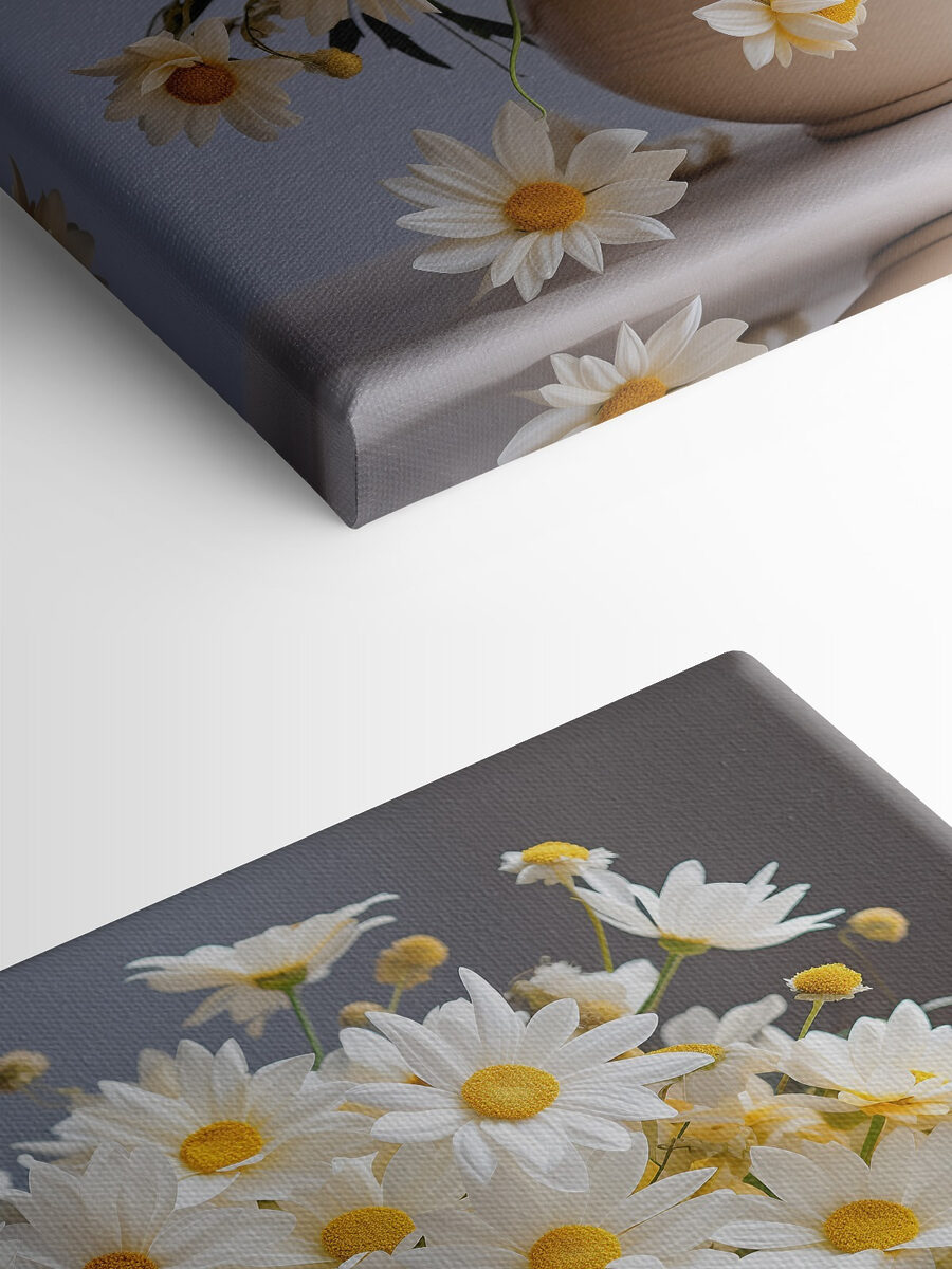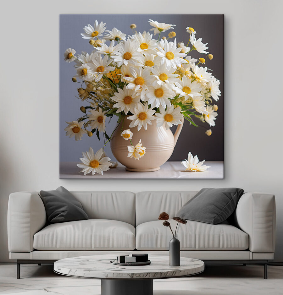 Verschönern Sie Ihren Raum mit diesem bezaubernden Leinwandbild, das blühende Gänseblümchen in einer charmanten Keramikvase zeigt. Es ist wie ein Ausbruch von Sonnenschein, direkt an Ihrer Wand! Stellen Sie sich vor, Sie betreten einen Raum und spüren sofort diese fröhliche Stimmung, als ob Sie gerade durch einen sonnenbeschienenen Garten spazieren gegangen wären. Der verspielte Tanz der Blütenblätter und die leuchtenden Farben laden zum Lächeln und zur Wärme ein und eignen sich daher perfekt für jede Ecke, die einen Spritzer Leben braucht. Es ist nicht nur Dekoration, sondern auch ein Gesprächsanlass, ein kleines Stück Natur, das nie verwelkt. Wer würde nicht gerne ein wenig von dieser alltäglichen Freude spüren? Verwandeln Sie Ihre Wände und lassen Sie die Gänseblümchen ihren Zauber wirken!