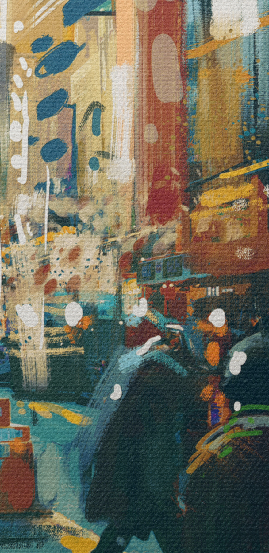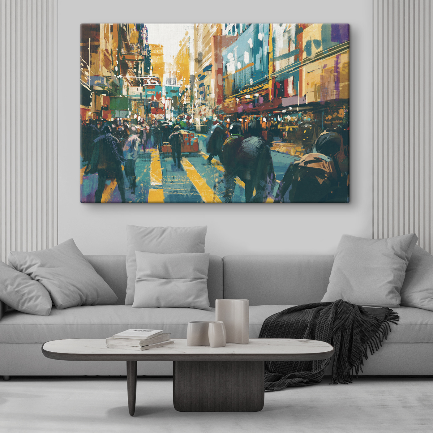 Tauchen Sie mit diesem lebendigen Leinwandbild in das pulsierende Leben der Stadt ein. Stellen Sie sich eine belebte Straße vor, auf der eine bunte Gruppe von Menschen vorbeischlendert, jeder mit seiner eigenen Geschichte und seinem eigenen Ziel. Die farbenfrohe Architektur umgibt sie wie eine lebendige Kulisse und macht jeden Blick zu einem Abenteuer. Es ist wie ein Schnappschuss eines spontanen Moments, der Ihrem Raum ein Gefühl von Bewegung und Aufregung verleiht. Stellen Sie sich vor, es in einer gemütlichen Ecke aufzuhängen – perfekt, um Gespräche anzuregen oder einfach von Ihrem nächsten Städtetrip zu träumen. Holen Sie sich den Puls der Stadt nach drinnen!