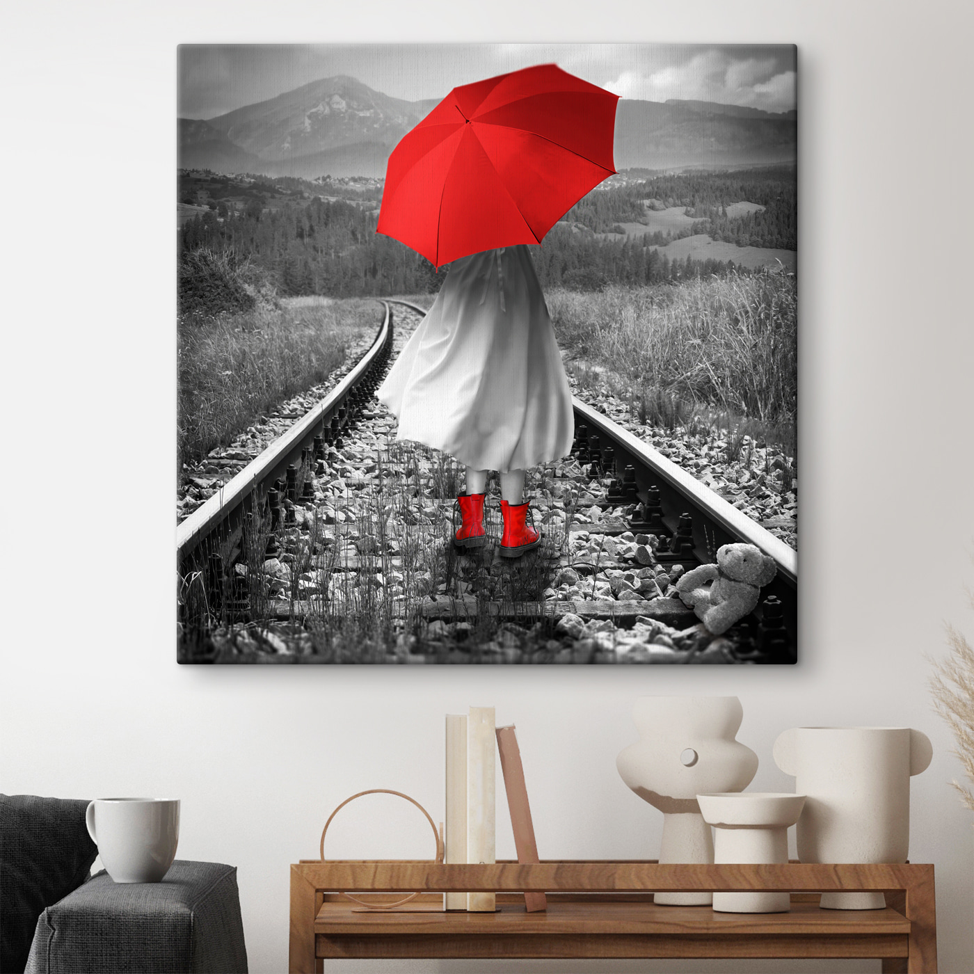 Sehen Sie sich diesen auffälligen Leinwanddruck “Person mit rotem Regenschirm” an. Perfekt für alle, die einen Farbklecks vor einem stimmungsvollen schwarz-weißen Hintergrund lieben. Es ist, als wäre die Szene direkt aus einem Filmklassiker entsprungen – eine Szene, in der man etwas gedankenverloren an einem regnerischen Tag die Gleise entlang läuft. Der leuchtend rote Regenschirm und die Stiefel sind ein echter Hingucker, nicht wahr? Es ist fast so, als wollten sie sagen: “Hey, es gibt noch Farbe und Hoffnung in dieser Welt!” Dieses Stück würde sich hervorragend in einem Wohnzimmer oder Arbeitszimmer machen – überall dort, wo Sie einen Hauch von Drama und einen Hauch von Laune brauchen. Es ist ein Statement-Stück, das einen in seinen Bann zieht und einen über die Geschichte dahinter nachdenken lässt. War es ein spontanes Abenteuer? Eine durchdachte Reise? Ein Hauch von Mysterium, wie es jedes großartige Kunstwerk haben sollte.