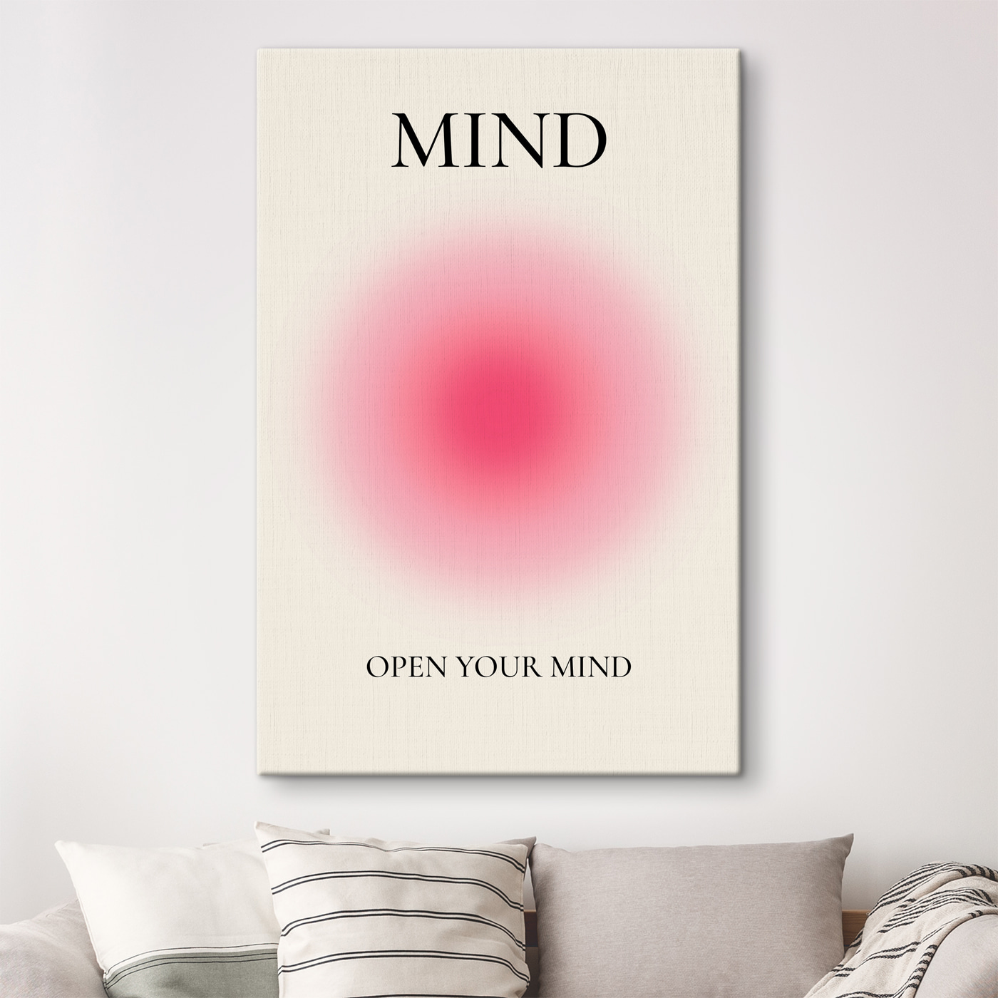 Stellen Sie sich Folgendes vor: Sie kommen in Ihr Wohnzimmer und – zack – starrt Sie dieses beeindruckende Leinwandbild an. Das schlichte, einfache Design schreit geradezu nach Raffinesse. Schwarze Buchstaben auf einem strahlend weißen Hintergrund – ein echter Hingucker. Darauf steht “Mind” und darunter “Open Your Mind”, eingerahmt von einem sanft strahlenden rosa Kreis. Es ist wie eine tägliche Erinnerung daran, neugierig zu bleiben, und sorgt für ein entspanntes und nachdenkliches Gefühl in Ihrem Raum.