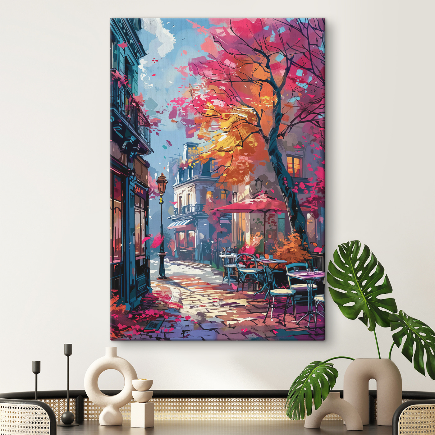 Betreten Sie eine gemütliche Szene, die Geschichten von kühlen Tagen und warmen Getränken erzählt, mit diesem entzückenden Leinwanddruck. Stellen Sie sich vor, Sie schlendern eine bezaubernde Straße entlang, die von Bäumen in leuchtenden Herbstfarben gesäumt ist, wobei jedes Blatt eine Geschichte erzählt. Die einladenden Cafés laden zum Verweilen ein – der perfekte Ort, um etwas Süßes zu schlürfen und die Leute zu beobachten. Der lebhafte Aquarellstil fängt den spielerischen Tanz zwischen der Hitze des Sommers und der Kälte des Winters ein und verwandelt jeden Raum in ein gemütliches Refugium. Erhellen Sie die tristen Wände und lassen Sie sich von der Schönheit des Herbstes umarmen. Wer wünscht sich nicht einen Hauch dieses jahreszeitlichen Zaubers für sein Zuhause?