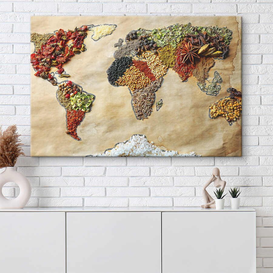 Hallo, liebe Deko-Fans! Seht euch diesen tollen Leinwanddruck “Map of the World Made of Spices” an. Ein echter Gesprächsanlass! Stellen Sie sich das Bild in Ihrer Küche oder Ihrem Esszimmer vor – jedes Mal, wenn Sie es betrachten, ist es wie ein globales kulinarisches Abenteuer. Jeder Kontinent besteht aus verschiedenen Gewürzen, Texturen und Farben. Da fragt man sich doch, wie jedes Gewürz riecht und schmeckt, oder?