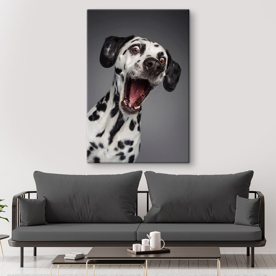 Stellen Sie sich vor, Sie betreten Ihr Zimmer und werden von diesem entzückenden Dalmatiner mit seinen großen Augen und seinem überraschten Gesichtsausdruck auf einem Leinwanddruck begrüßt. Es ist, als würde man einen Moment reiner Hundedramatik festhalten, der jeden zum Lächeln bringt. Perfekt für alle, die ein wenig Skurrilität in ihrer Einrichtung lieben. Dieses Bild bringt eine fröhliche und verspielte Stimmung in jeden Raum – als hätte Ihr Hund gerade das Wort “Gassi gehen” gehört oder ein unerwartetes Leckerli entdeckt!