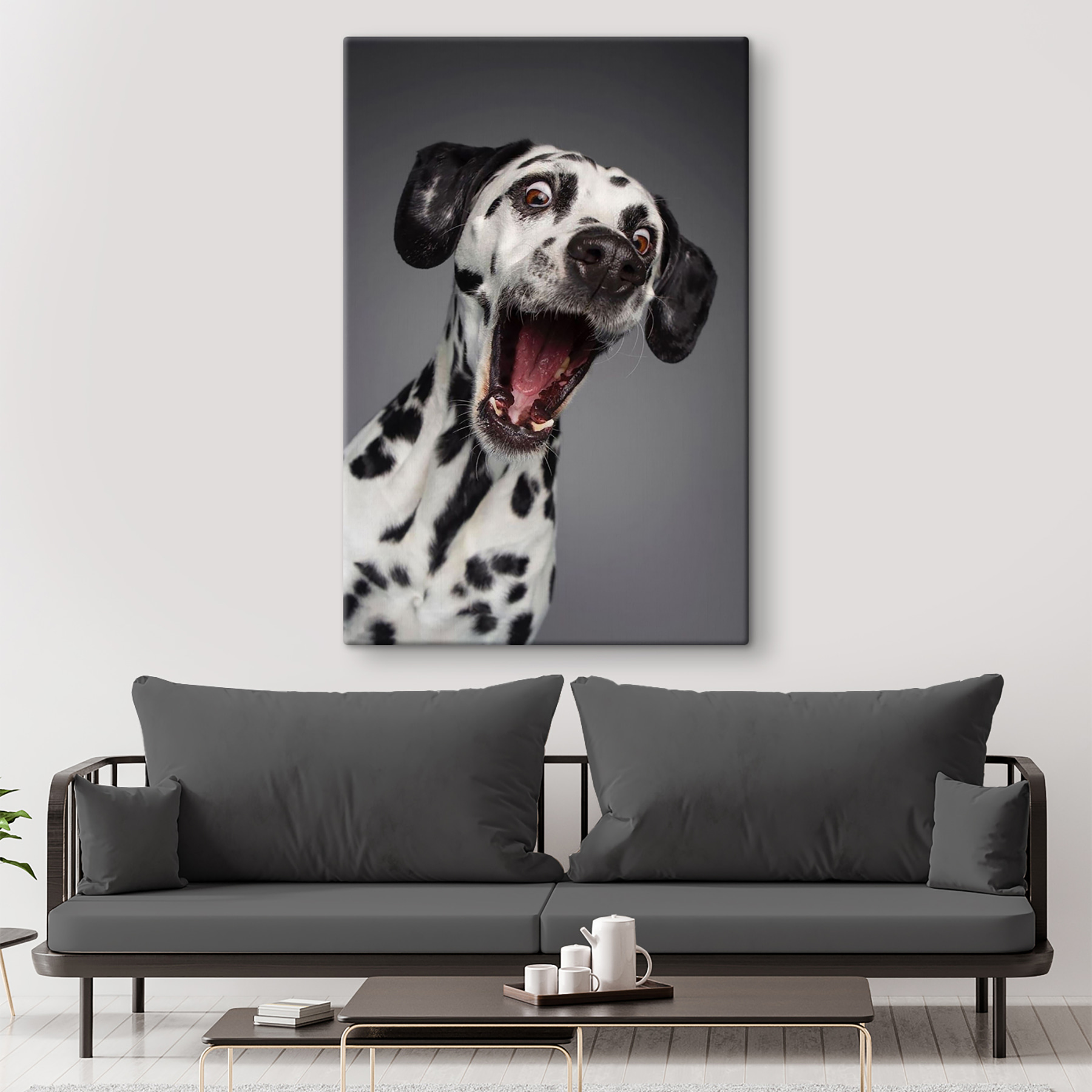 Stellen Sie sich vor, Sie betreten Ihr Zimmer und werden von diesem entzückenden Dalmatiner mit seinen großen Augen und seinem überraschten Gesichtsausdruck auf einem Leinwanddruck begrüßt. Es ist, als würde man einen Moment reiner Hundedramatik festhalten, der jeden zum Lächeln bringt. Perfekt für alle, die ein wenig Skurrilität in ihrer Einrichtung lieben. Dieses Bild bringt eine fröhliche und verspielte Stimmung in jeden Raum – als hätte Ihr Hund gerade das Wort “Gassi gehen” gehört oder ein unerwartetes Leckerli entdeckt!