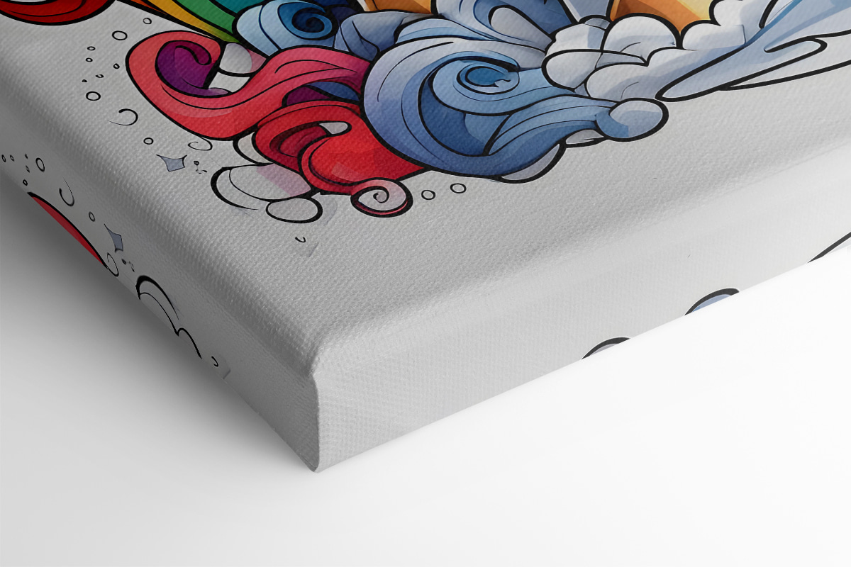 Es ist kein alltägliches Kunstwerk; es ist wie ein Ausbruch von Freude und Laune in einem Rahmen. Perfekt, um jedem ein Lächeln ins Gesicht zu zaubern, egal ob man damit aufwacht oder es vor dem Schlafengehen sieht. Und mal ehrlich, wer braucht nicht täglich eine Dosis Regenbögen und Magie? Dieses Werk schreit förmlich danach, angebetet zu werden. Es ist eine fröhliche Kulisse, die Geschichten von Fantasie und Spaß erzählt.