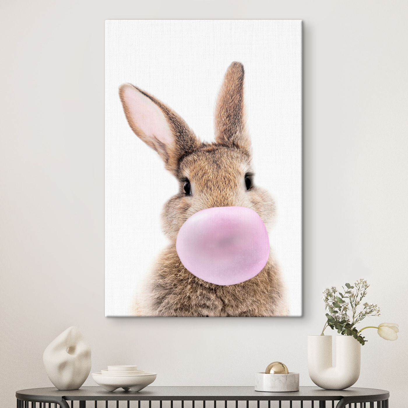 Stellen Sie sich vor, Sie gehen in ein Kinderzimmer und *bumm*, da starrt Ihnen dieser super verspielte Leinwanddruck ins Gesicht. Es ist ein Hase, aber nicht irgendein Hase. Dieses kleine Fellknäuel pustet eine Kaugummiblase! Wie wahnsinnig niedlich ist das denn? Perfekt, um ein Kichern auszulösen und dem Raum einen skurrilen Touch zu verleihen.