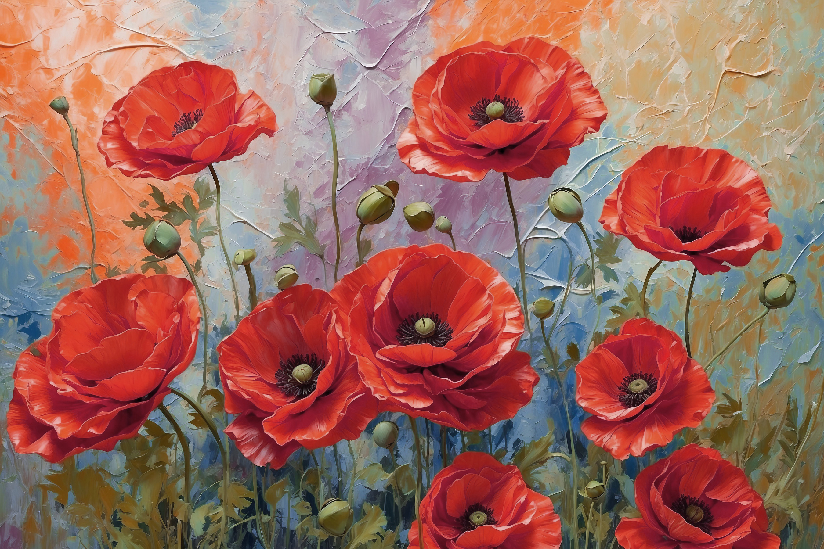 Haben Sie jemals das Gefühl, dass Ihre Wände einfach… öde sind? Verleihen Sie ihnen einen Hauch von Leben mit diesem Leinwanddruck “Lebendige Mohnblumen unter gemaltem Himmel”. Es ist wirklich wie ein Traum, in dem Mohnblumen im Wind tanzen! Wie sich die leuchtenden Rottöne vor dem verträumten pastellfarbenen Hintergrund abheben – das ist pure Magie. Stellen Sie sich diese Schönheit in Ihrem Wohnzimmer vor und setzen Sie damit einen Farbtupfer, der Ihren Raum fröhlicher und frischer macht und Sie einfach mehr Sie selbst sein lässt. Ehrlich gesagt könnte es sogar dazu führen, dass Sie jedes Mal, wenn Sie vorbeigehen, anhalten und an den nicht vorhandenen Blumen riechen wollen. Perfekt für Blumenliebhaber und alle, die ein bisschen fröhliches, künstlerisches Chaos in ihrer Einrichtung gebrauchen können.