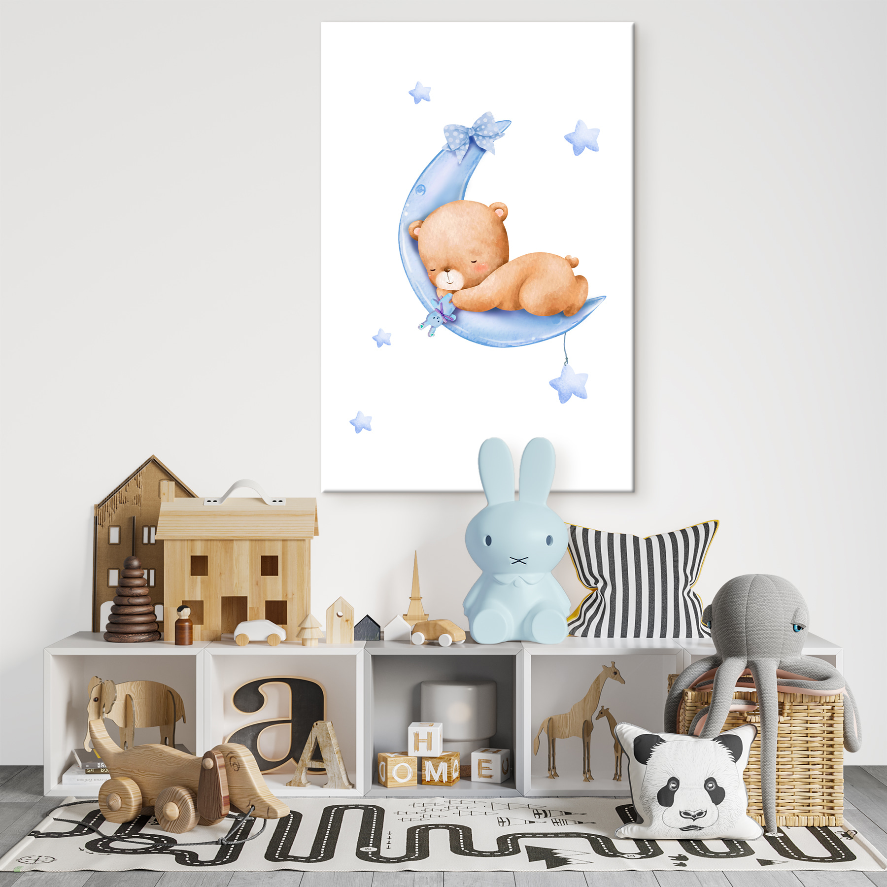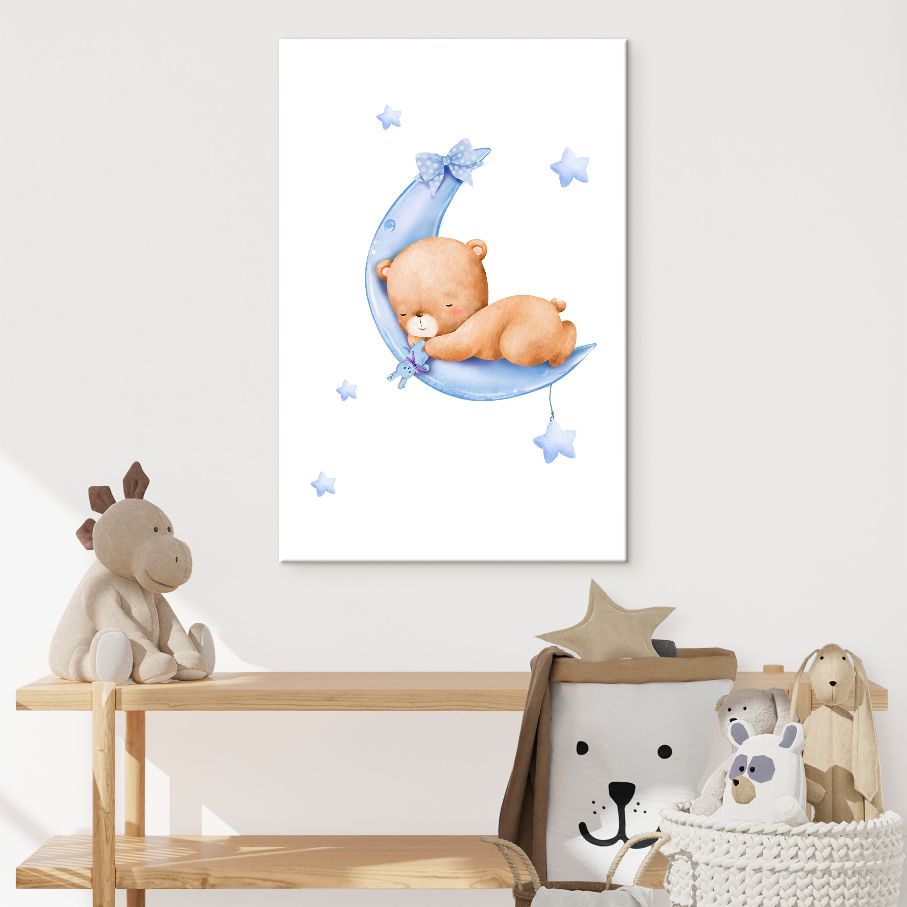 Stellen Sie sich diesen süßen Leinwanddruck mit einem Teddybären, der auf einer Mondsichel schläft, im Zimmer Ihres Kindes vor. Es trägt den Titel “Teddybär schläft auf dem Mond” und gehört zu einer ganzen Reihe von lustigen Kategorien: Leinwandbilder für Kinder, Leinwandbilder mit Tieren und Beliebte Leinwandbilder. Es ist also ziemlich beliebt!