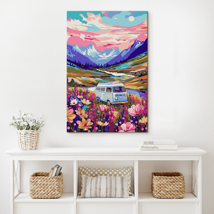 Haben Sie schon einmal etwas betrachtet und dabei pure Freude empfunden? Dieser Leinwanddruck eines alten Lieferwagens in einem Feld mit leuchtenden Blumen fängt dieses Gefühl ein. Stellen Sie sich dieses Bild an Ihrer Wand vor – es ist, als ob Sie einen Hauch von Glück in Ihr Zimmer bringen würden. Die Farben sind so leuchtend und fröhlich, der Himmel ist rosa, die Berge sind lila, und es gibt ein paar Wildblumen. Es ist, als wäre der Hippie-Roadtrip Ihrer Träume in der Zeit eingefroren worden. Jeder, der den Raum betritt, wird sich auf das Abenteuer einlassen wollen. Perfekt für jeden, der die Natur und ein bisschen Laune liebt. Spüren Sie nicht auch den Frieden?