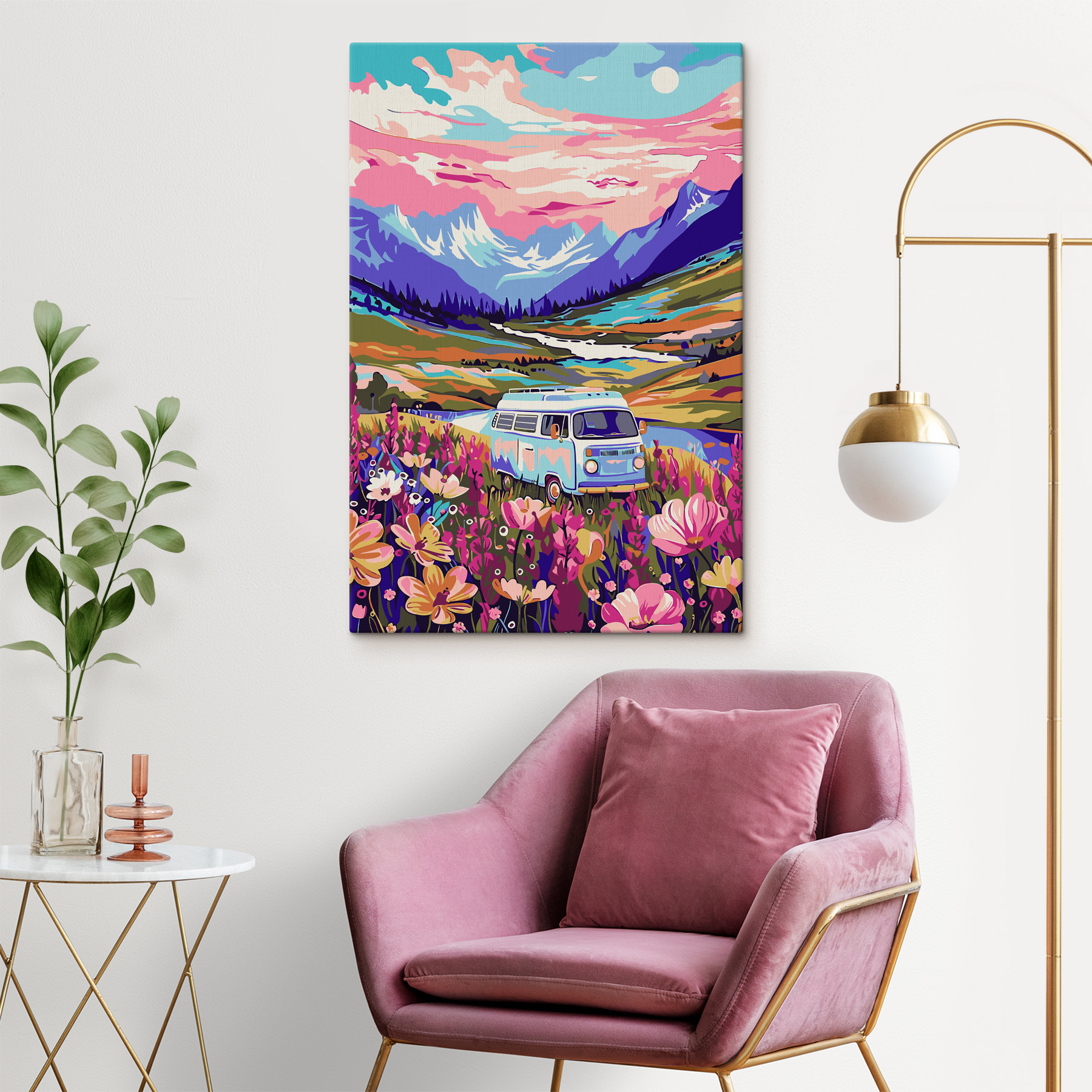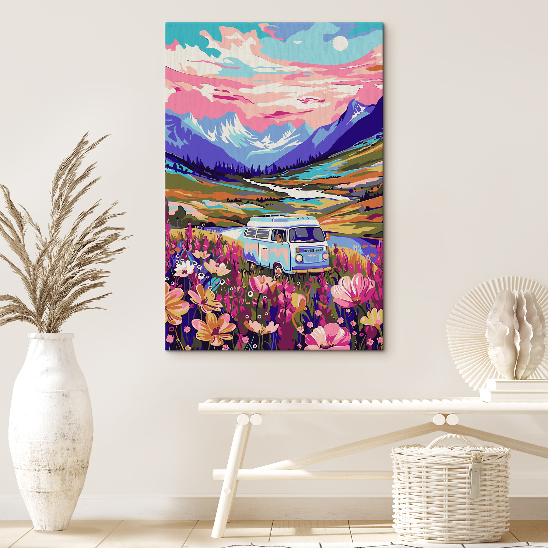 Haben Sie schon einmal etwas betrachtet und dabei pure Freude empfunden? Dieser Leinwanddruck eines alten Lieferwagens in einem Feld mit leuchtenden Blumen fängt dieses Gefühl ein. Stellen Sie sich dieses Bild an Ihrer Wand vor – es ist, als ob Sie einen Hauch von Glück in Ihr Zimmer bringen würden. Die Farben sind so leuchtend und fröhlich, der Himmel ist rosa, die Berge sind lila, und es gibt ein paar Wildblumen. Es ist, als wäre der Hippie-Roadtrip Ihrer Träume in der Zeit eingefroren worden. Jeder, der den Raum betritt, wird sich auf das Abenteuer einlassen wollen. Perfekt für jeden, der die Natur und ein bisschen Laune liebt. Spüren Sie nicht auch den Frieden?