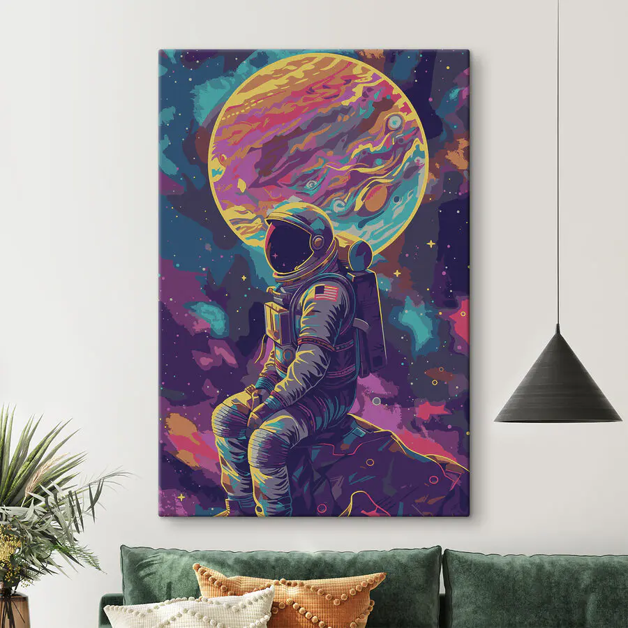Verwandeln Sie jeden Raum in ein kosmisches Abenteuer mit diesem lebhaften Leinwanddruck eines Astronauten im Weltraum. Stellen Sie sich vor: Sie sitzen in Ihrem Wohnzimmer und Ihr Blick wandert zu einer Figur, die friedlich auf wirbelnde Galaxien und einen riesigen, bunten Planeten blickt. Es ist wie eine kleine Flucht ins Universum, ohne die Couch zu verlassen. Die Blau-, Rosa- und Violetttöne vermischen sich in einer Weise, die fast magisch wirkt. Perfekt für alle, die von den Sternen träumen oder einfach einen Hauch von interstellarem Wunder in ihrem Leben brauchen. Ihre Freunde werden Sie bestimmt fragen, woher die coole Kunst stammt. Wer weiß – vielleicht inspiriert dieser kosmische Freund ja zum nächsten großen Traum!
