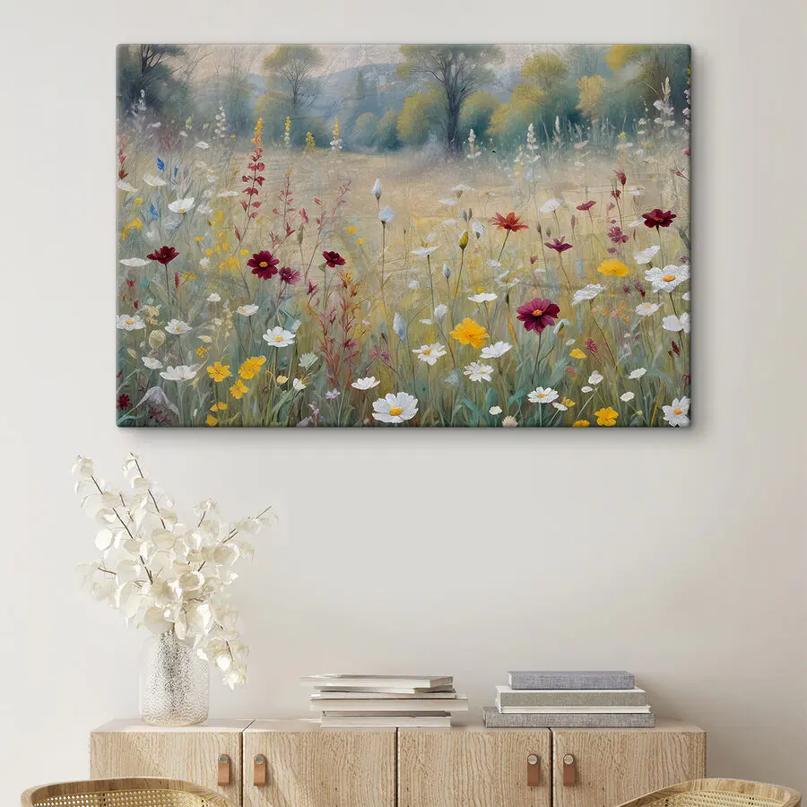 Stellen Sie sich vor, Sie spazieren über eine herrliche Sommerwiese mit all den schönen, leuchtenden Wildblumen, die sich sanft in der Brise wiegen. Dieser Leinwanddruck fängt diesen magischen Moment perfekt ein. Es ist, als würde man sich ein Stück Natur direkt nach Hause holen. Die Farben sind lebendig und belebend, und der Anblick des Bildes vermittelt ein Gefühl der Ruhe. Perfekt, um jeden Raum zu verschönern – ob Wohnzimmer, Schlafzimmer oder sogar Büro. Hängen Sie es dort auf, wo Sie einen kleinen Schub an Glücksgefühlen brauchen. Das warme und einladende Bild erinnert Sie daran, das Tempo zu drosseln und die kleinen Freuden des Lebens zu schätzen. Ein echter Hingucker, der bei Gästen für Gesprächsstoff und Bewunderung sorgen wird!