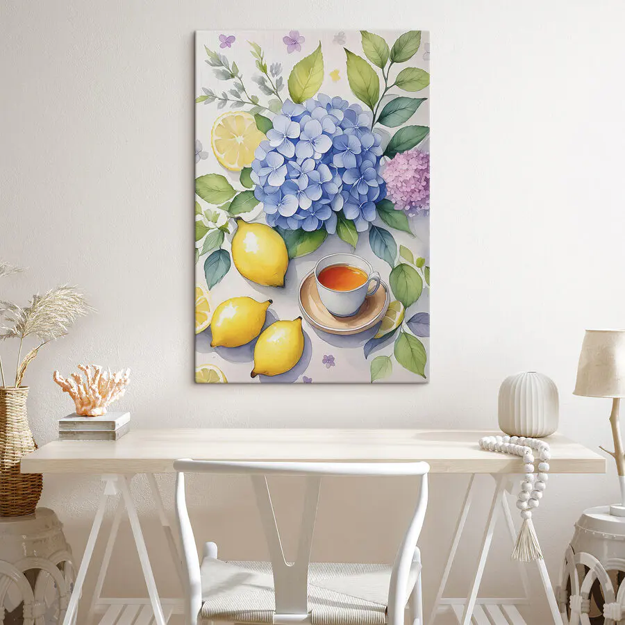 Stellen Sie sich eine gemütliche Ecke vor, in der eine warme Tasse Tee auf die vibrierende Energie von frischen Zitronen und Blumen trifft. Dieser Leinwanddruck “Tee mit Zitronen und Blumen” fängt diesen perfekten Moment der Ruhe ein und erinnert an eine sanfte Brise und den Duft von Zitrusfrüchten, der durch die Luft weht. Die zarten Blüten und die pikanten Früchte harmonieren wunderbar und lassen jede Wand mit Farbe und Charakter lebendig erscheinen. Stellen Sie es sich über einem Schreibtisch oder in einer sonnigen Frühstücksecke vor, wo es das ganze Jahr über einen Hauch von Frühling verströmt. Dieses Stück ist nicht nur Kunst, es ist eine Einladung zum Nippen, Genießen und Entspannen. Jeder Blick kann Sie in einen heiteren Garten entführen, selbst an den hektischsten Tagen. Perfekt für alle, die die einfachen Freuden des Lebens zu schätzen wissen.