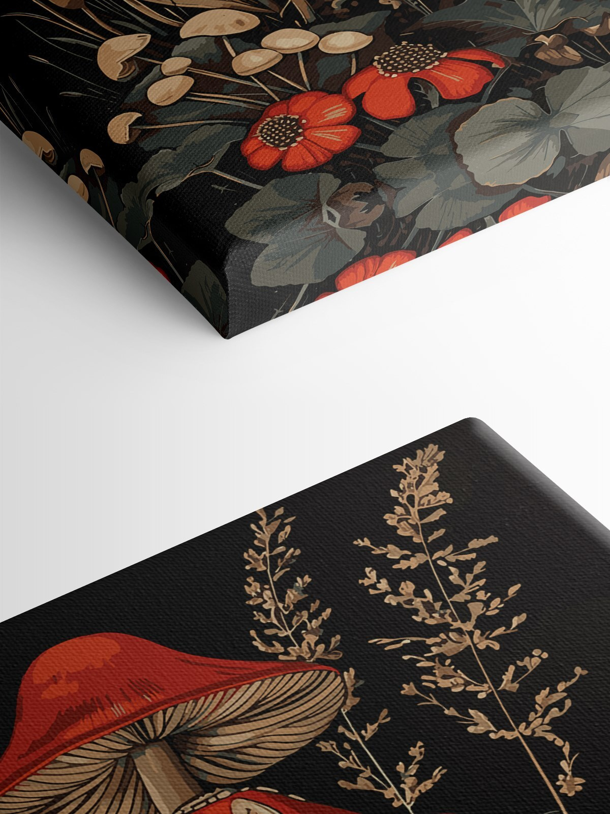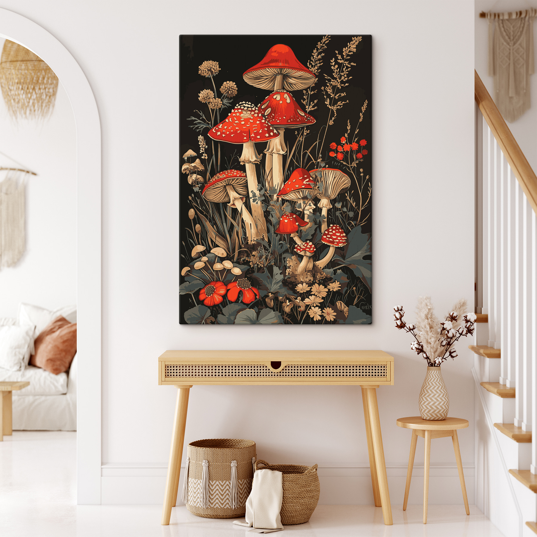 Stellen Sie sich vor, Sie würden Ihr Zuhause mit diesem charmanten Leinwandbild mit rotköpfigen Pilzen inmitten einer Blumenlandschaft mit einem Hauch von Waldmagie versehen. Perfekt für Naturliebhaber und alle, die es gerne skurril mögen, fängt dieses Bild die malerische, gemütliche Atmosphäre eines verwunschenen Waldes ein. Können Sie sich nicht vorstellen, wie es Ihre Küchenecke oder Ihre Leseecke verschönert? Die satten, erdigen Töne und die leuchtenden Rottöne vermitteln das Gefühl, als wären Sie gerade über einen geheimen Garten gestolpert. Lassen Sie dieses Kunstwerk einen Hauch von märchenhaftem Wunder in Ihr tägliches Leben bringen!