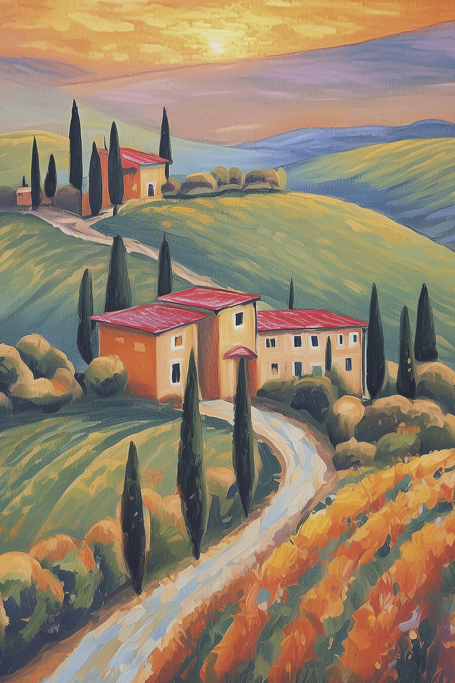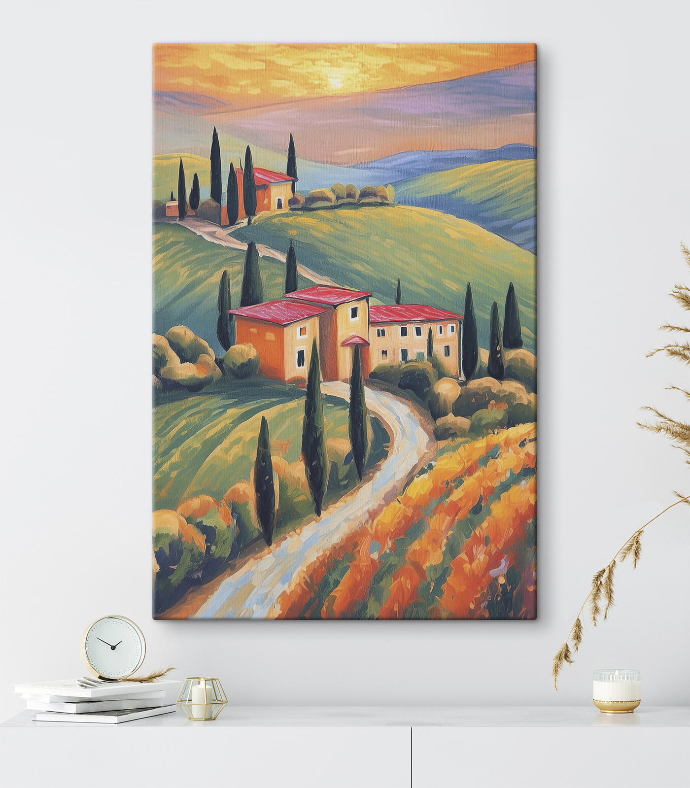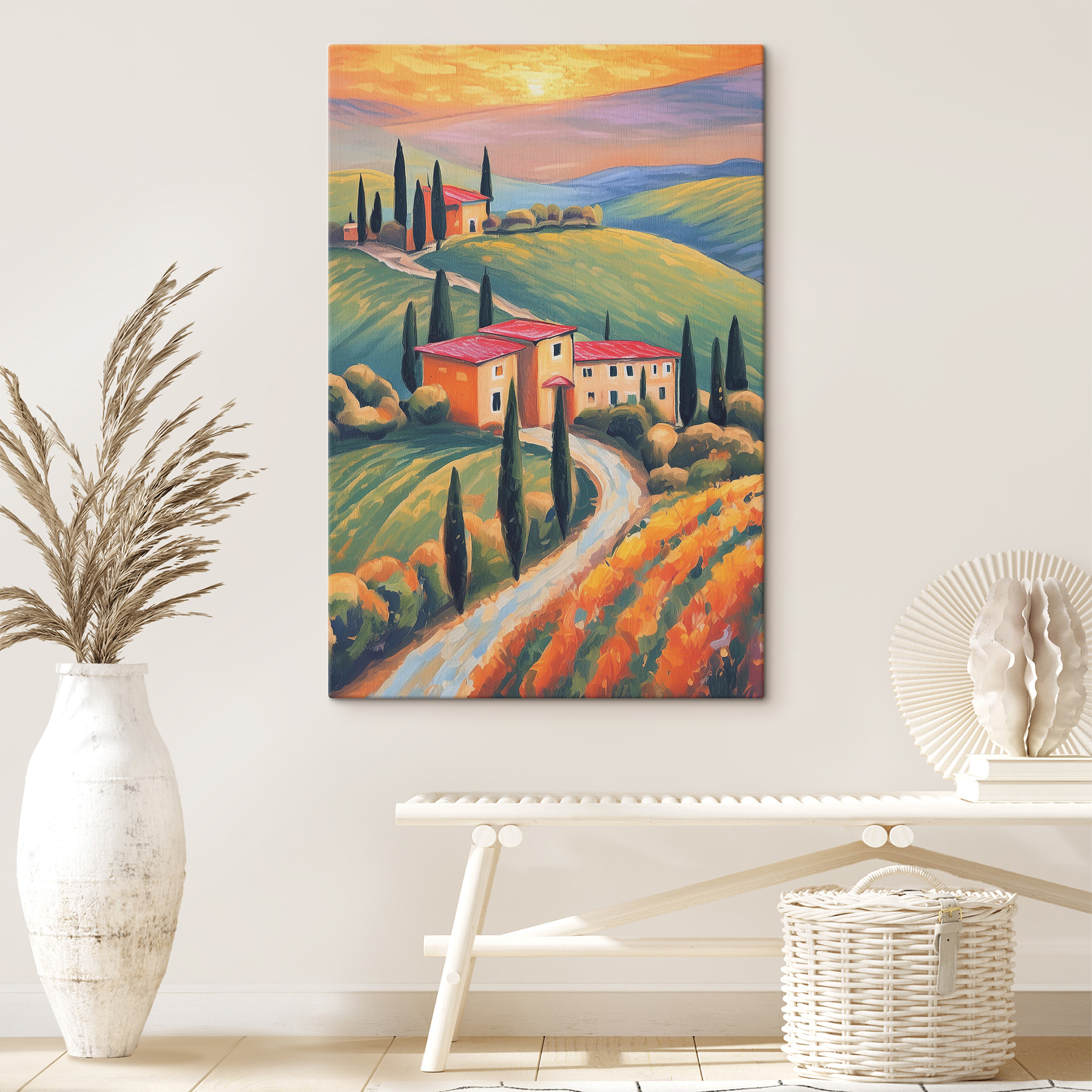 Verwandeln Sie eine leere Wand in einen gemütlichen Rückzugsort mit diesem charmanten Leinwandbild eines Hauses inmitten üppiger grüner Hügel. Die warmen Farbtöne des Sonnenuntergangs und die lebendige Landschaft vermitteln ein Gefühl von Frieden und Gelassenheit, fast so, als ob man das sanfte Rascheln der Blätter oder das ferne Zwitschern der Vögel hören könnte. Stellen Sie sich vor, Sie schlürfen einen Kaffee, während Sie diese wunderschöne Szene betrachten – es ist wie Ihr eigenes Stück vom Paradies. Dieses Kunstwerk passt perfekt in jeden Raum, verleiht ihm einen Hauch von Laune und lädt ein, sich wie zu Hause zu fühlen. Es ist nicht nur ein Bild, sondern eine tägliche Erinnerung an einfache Freuden. Wer würde das nicht lieben?