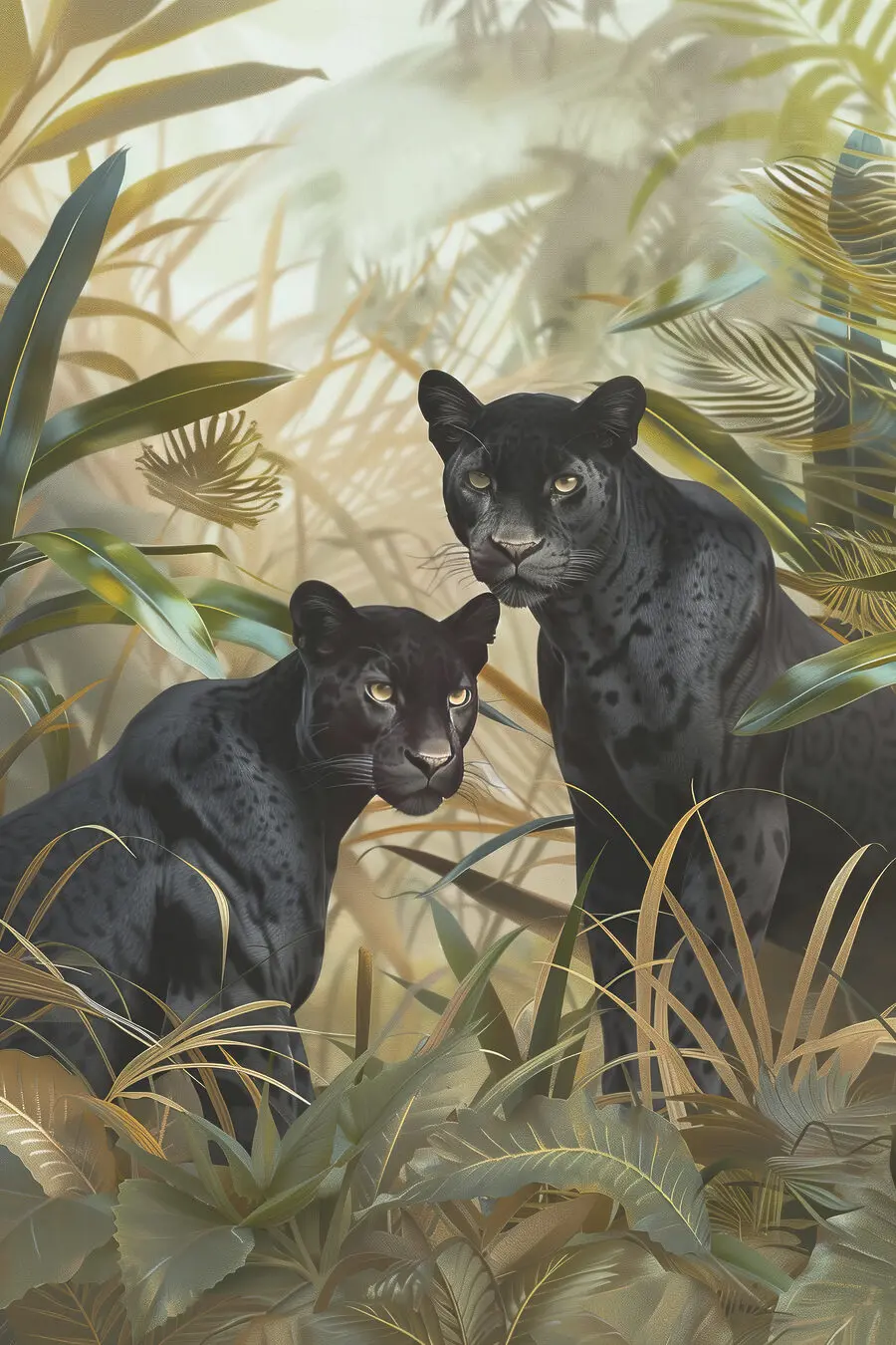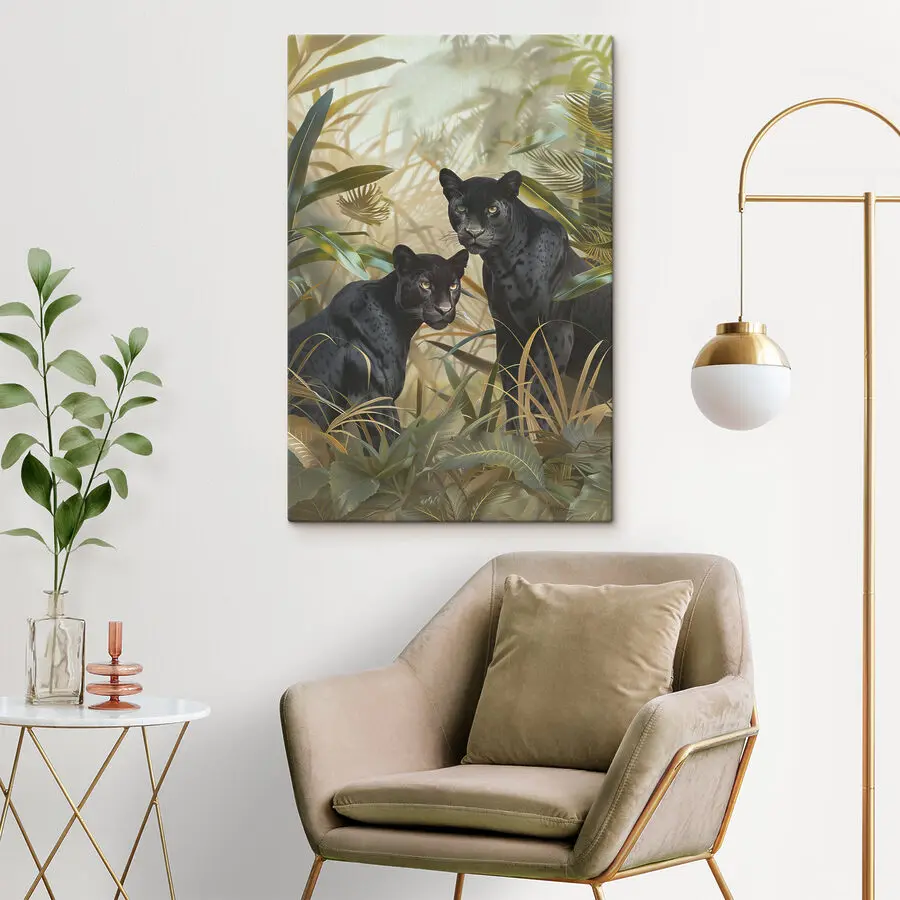 Haben Sie schon immer davon geträumt, sich ein Stück Wildnis in Ihr Wohnzimmer zu holen? Dieser Leinwanddruck “Schwarzer Panther mit gelben Augen” ist Ihre Eintrittskarte in den Dschungel. Zwei prächtige schwarze Panther, eingefangen mit diesen stechenden gelben Augen, wirken fast so, als würden sie Ihren Raum bewachen. Sie fügen sich nahtlos in das üppige Grün ein und verleihen Ihren Wänden einen Hauch von Geheimnis und – ich wage es zu sagen – ein wenig Abenteuer.