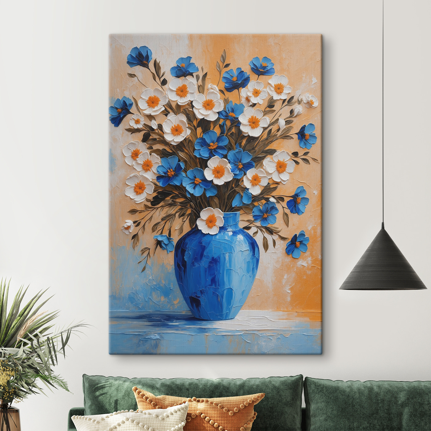 Dieser lebendige Leinwanddruck mit einem atemberaubenden Blumenarrangement in einer leuchtend blauen Vase verwandelt jeden Raum. Die lebendigen Farben, von fröhlichem Weiß bis hin zu kokettem Blau, bringen einen erfrischenden Pop, der selbst die trübsten Tage aufhellen kann. Stellen Sie sich das Arrangement in einer gemütlichen Ecke oder über einem warmen Kaffee vor – stellen Sie sich vor, wie Sie an einem Schluck nippen, während Sie von solch einer Schönheit umgeben sind. Es ist, als hätte man einen Mini-Garten zu Hause, nur ohne Gießkanne! Perfekt für Blumenliebhaber oder alle, die ihrer Einrichtung einen Hauch von natürlichem Charme verleihen wollen. Lassen Sie sich von den Blüten zu einem Lächeln inspirieren!