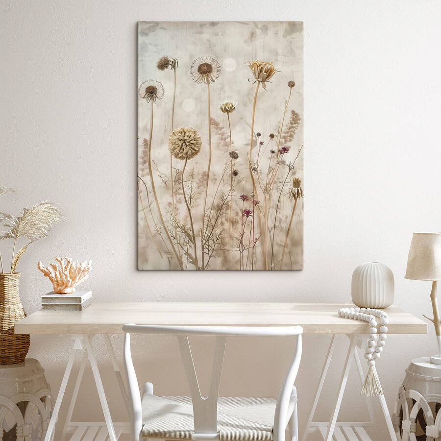 Holen Sie sich mit diesem Leinwandbild mit getrockneten Wildblumen einen Hauch von ländlicher Gelassenheit in Ihr Zuhause. Stellen Sie sich vor, Sie spazieren über eine friedliche Wiese – diese ruhigen, stillen Momente, in denen die Zeit einfach stehen bleibt. Dieses Kunstwerk fängt diese Stimmung perfekt ein.