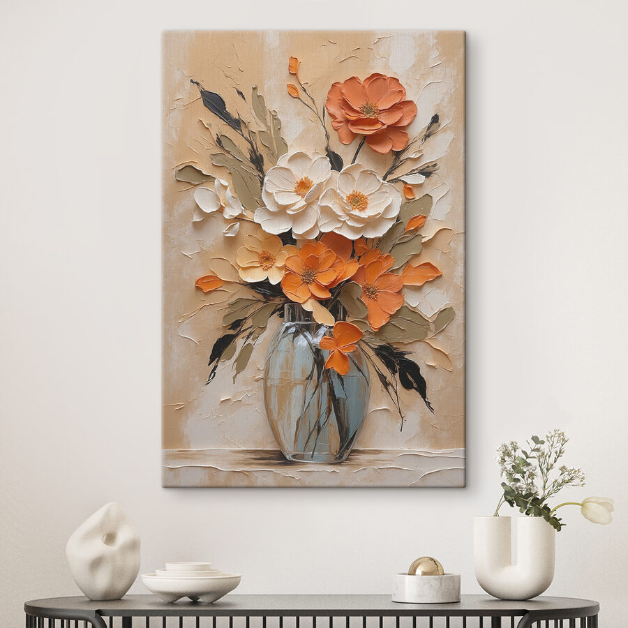 Stellen Sie sich vor, Sie betreten Ihr Wohnzimmer und werden von einer Farbenpracht begrüßt, die so erfrischend ist wie ein Frühlingsmorgen. Dieses “Wandbilder Painting of Flowers in a Vase” ist nicht nur ein Kunstwerk – es ist eine Persönlichkeit, die darauf wartet, Ihren Raum zu erhellen. Kräftige Orangetöne und sanftes Weiß mischen sich wie alte Freunde und bieten Wärme und Eleganz. Stellen Sie sich vor: Ein trüber Montag, Sie nippen an Ihrem Kaffee, werfen einen Blick auf dieses Meisterwerk und voilà – die Stimmung hebt sich sofort. Es ist wie ein Blumenstrauß, der nie verwelkt und immer für gute Laune sorgt. Perfekt für jede Wand, die sich nach ein bisschen mehr Freude sehnt.
