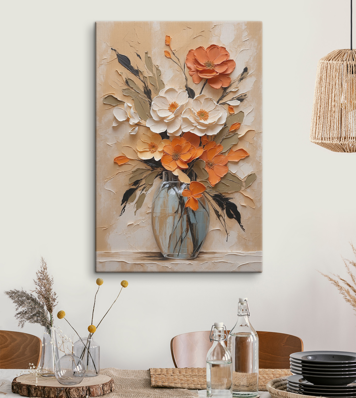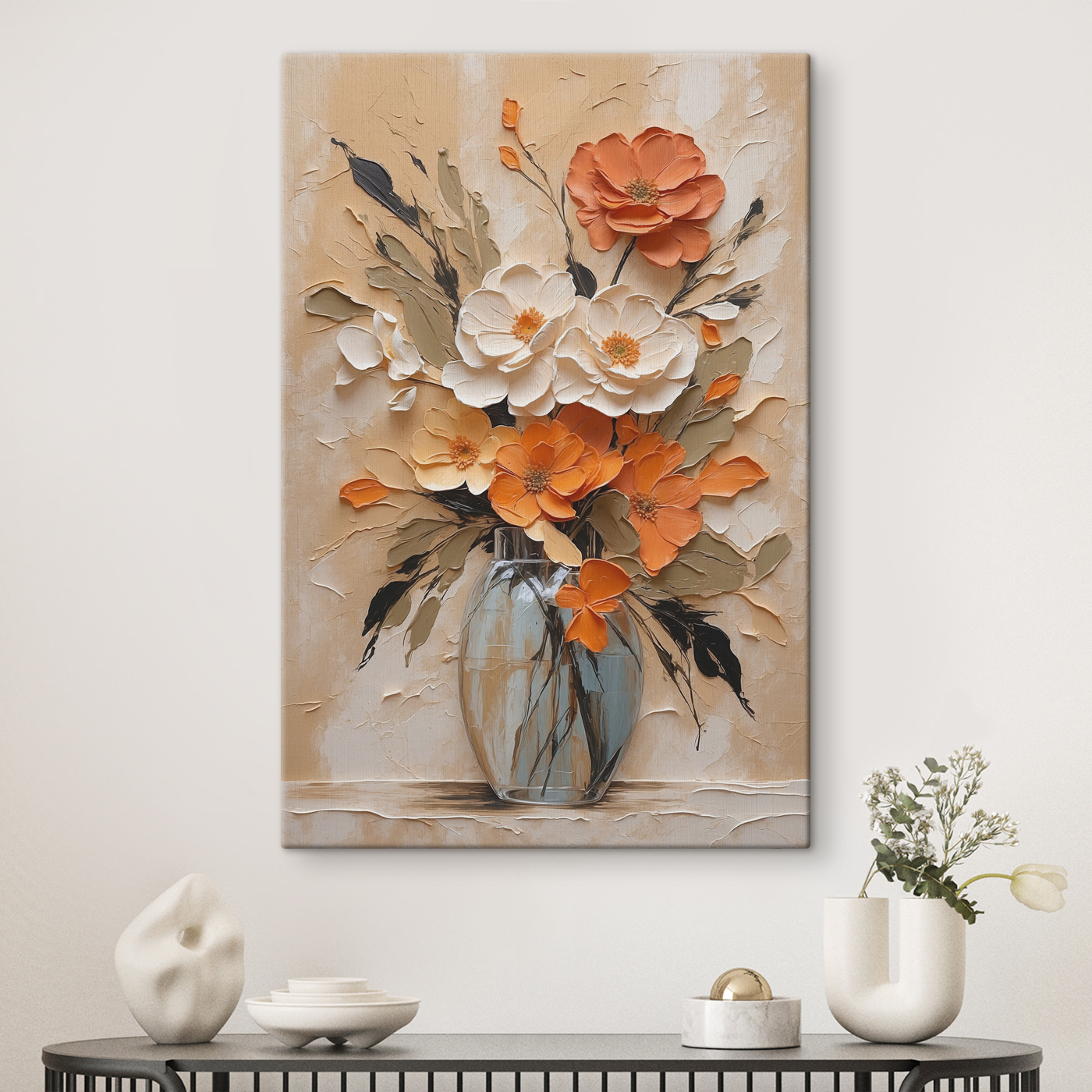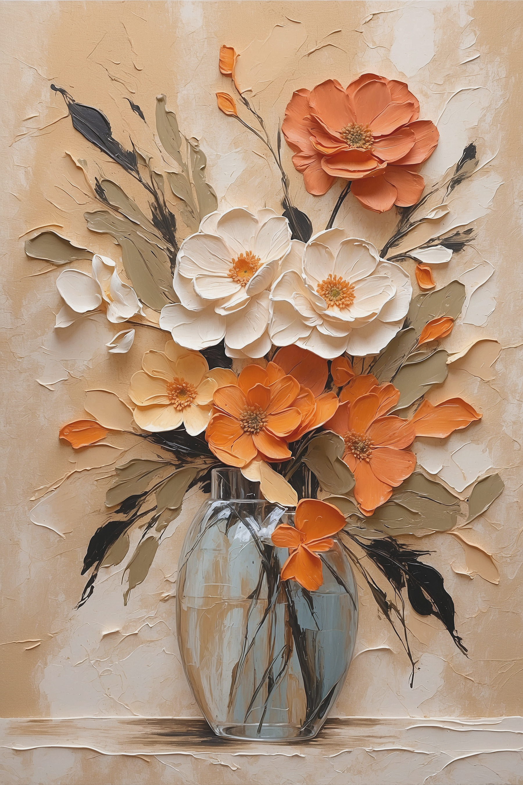 Stellen Sie sich vor, Sie betreten Ihr Wohnzimmer und werden von einer Farbenpracht begrüßt, die so erfrischend ist wie ein Frühlingsmorgen. Dieses “Wandbilder Painting of Flowers in a Vase” ist nicht nur ein Kunstwerk – es ist eine Persönlichkeit, die darauf wartet, Ihren Raum zu erhellen. Kräftige Orangetöne und sanftes Weiß mischen sich wie alte Freunde und bieten Wärme und Eleganz. Stellen Sie sich vor: Ein trüber Montag, Sie nippen an Ihrem Kaffee, werfen einen Blick auf dieses Meisterwerk und voilà – die Stimmung hebt sich sofort. Es ist wie ein Blumenstrauß, der nie verwelkt und immer für gute Laune sorgt. Perfekt für jede Wand, die sich nach ein bisschen mehr Freude sehnt.