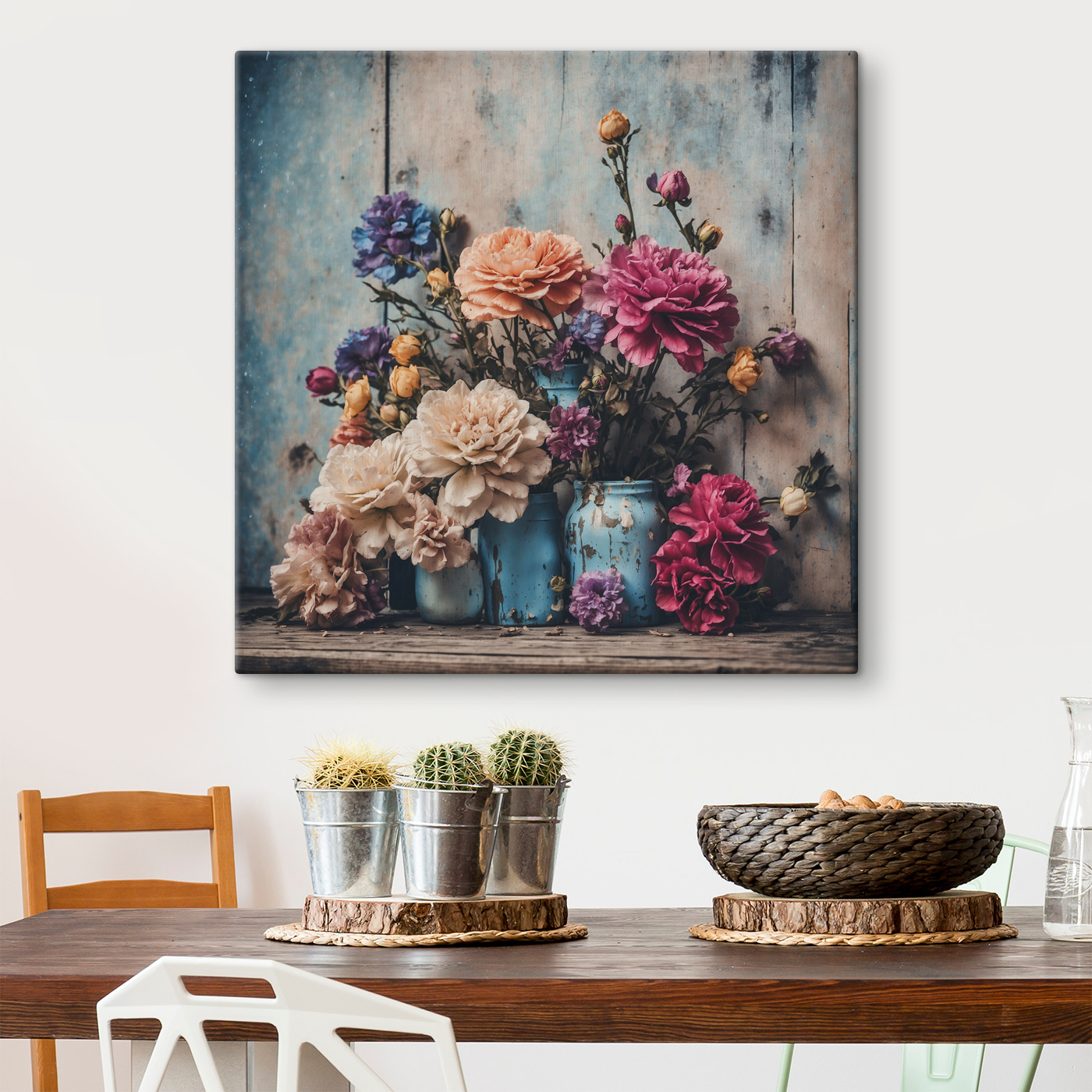 Stellen Sie sich einen Hauch von floraler Eleganz direkt an Ihrer Wand vor – dieser Leinwanddruck (Wandbilder s39161) fängt diesen rustikalen Charme perfekt ein! Die abgenutzten Einmachgläser mit den leuchtenden Blüten sehen aus, als wären sie gerade in einem alten Bauerngarten gepflückt worden. Hier trifft Vintage auf Lebendigkeit, und die zarten Blütenblätter kontrastieren wunderbar mit den verwitterten blauen Gläsern. Hängen Sie es auf, lehnen Sie sich zurück, und spüren Sie sofort, wie eine warme, gemütliche Atmosphäre den Raum erfüllt. Wie ein Hauch von frischer Luft nach einem sanften Regen… Das ist Nostalgie und Natur in einem fesselnden Stück. Ihre Gäste werden nicht aufhören, es zu bewundern – versprochen!