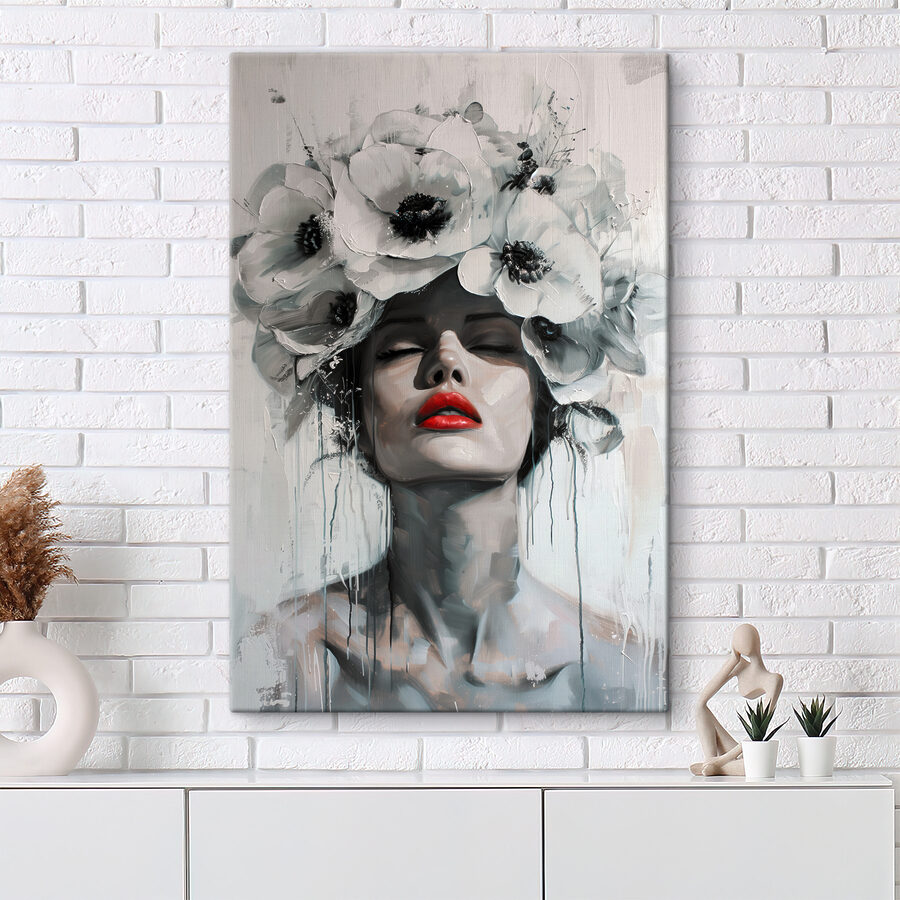 Verwandeln Sie jede Wand in einen Gesprächsanlass mit diesem atemberaubenden Leinwanddruck. Es zeigt eine Frau mit einer bezaubernden Blumenkrone, deren heiterer Ausdruck den Betrachter dazu einlädt, über die Schönheit der Natur und des eigenen Ausdrucks nachzudenken. Stellen Sie sich vor, Sie betreten einen Raum und werden sofort von ihrer fesselnden Präsenz angezogen – sie könnte fast Tagträume von Nachmittagen in Wildblumenfeldern auslösen! Der delikate Kontrast zwischen monochromen Tönen und leuchtenden Farben verleiht ihr ein modernes Flair. Dieses Stück eignet sich perfekt für gemütliche Ecken oder schicke Wohnräume, da es Raffinesse ausstrahlt und gleichzeitig eine lustige, künstlerische Ausstrahlung zeigt. Genießen Sie diese Inspirationen direkt an Ihren Wänden, sie heben jede Stimmung!
