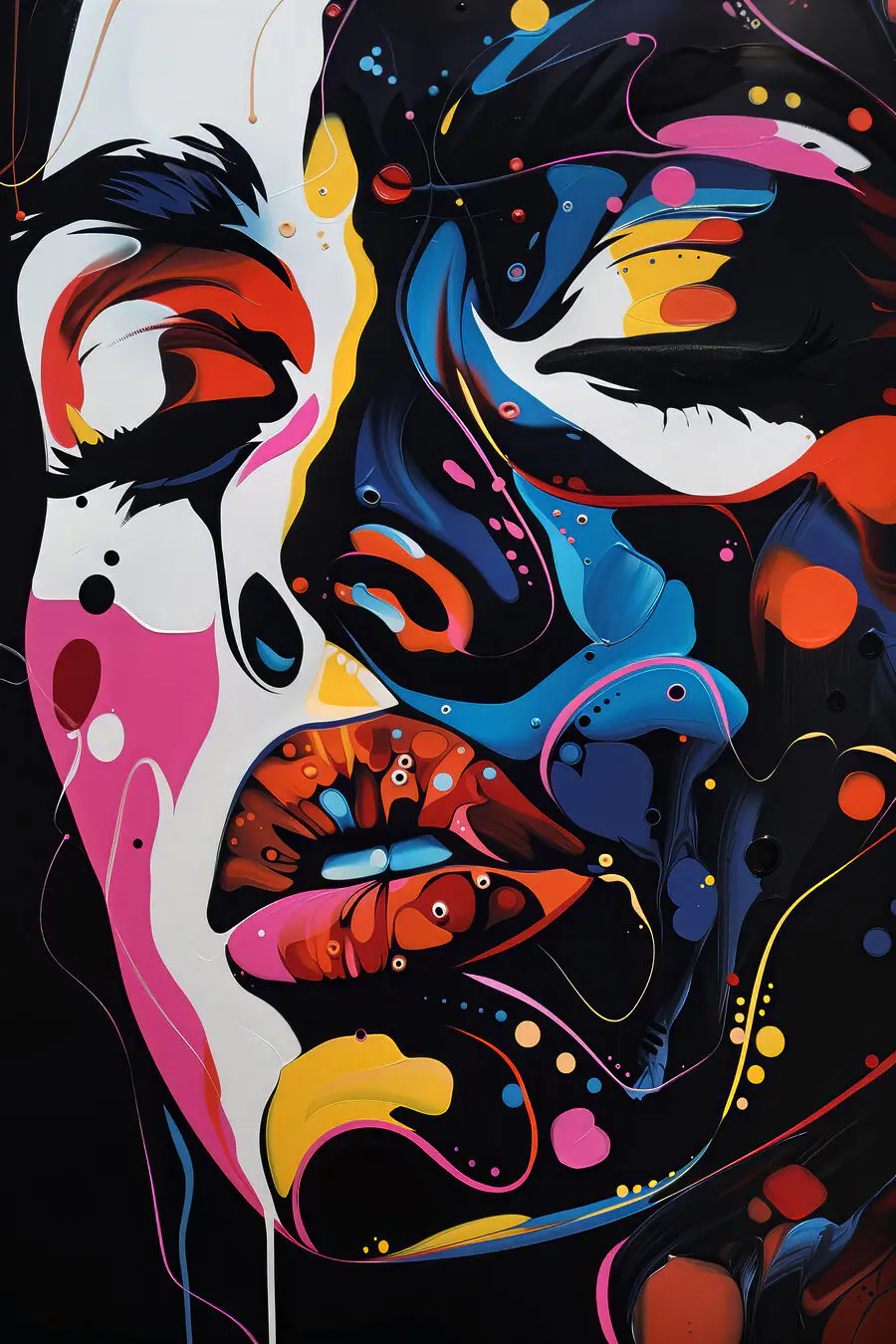 Tauchen Sie ein in die lebendige Welt dieses Leinwandbildes, auf dem das Gesicht einer Frau vor Farbe und Emotionen nur so strotzt. Stellen Sie sich vor, Sie sitzen in einer gemütlichen Ecke und schlürfen Kaffee, während ihr fesselnder Blick direkt zu Ihnen zu sprechen scheint. Die verspielten Wirbel und kräftigen Farbtöne vermitteln ein Gefühl der Freude und Energie, das jeden tristen Raum verwandeln kann.