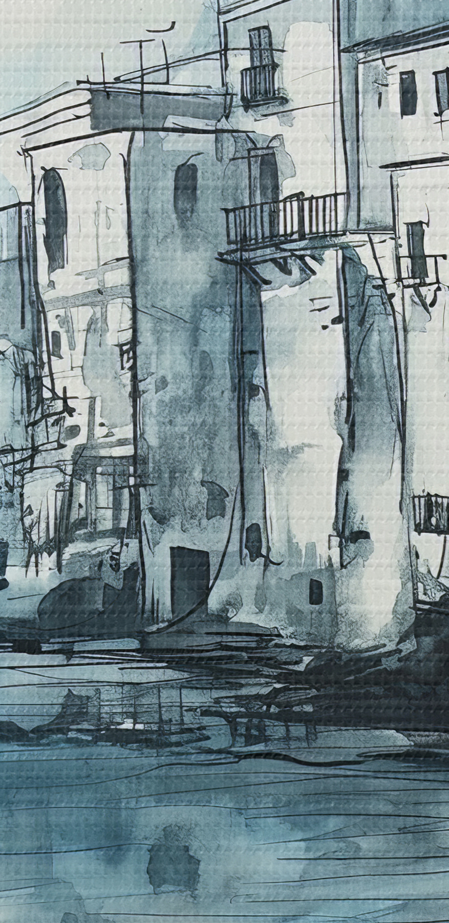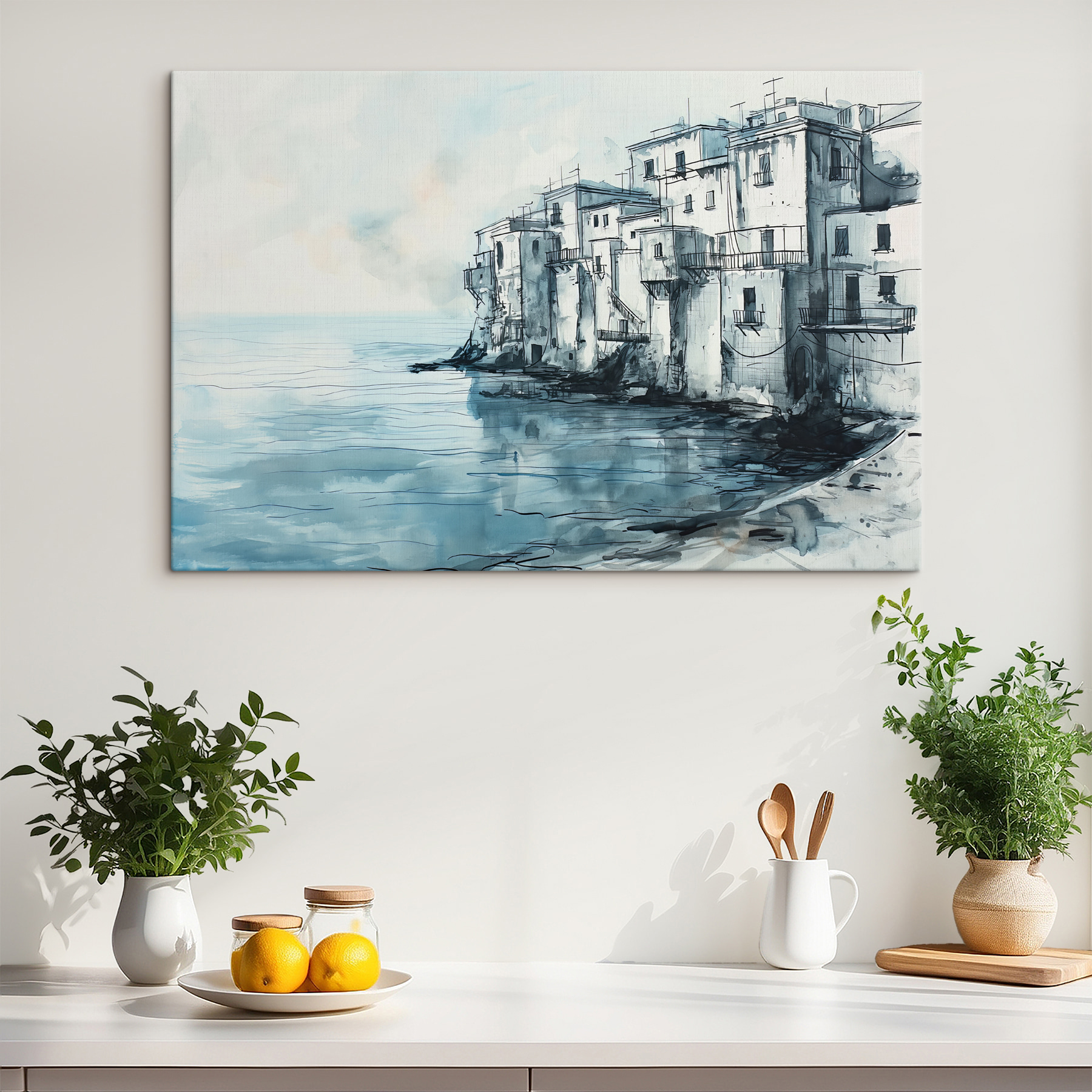Verwandeln Sie eine leere Wand in einen ruhigen Rückzugsort mit diesem Aquarelldruck eines charmanten Gebäudes am Ufer des Wassers. Stellen Sie sich das sanfte Rauschen der Wellen vor, während Sie an Ihrem Kaffee nippen und die leichte Brise direkt in Ihrem Wohnzimmer spüren. Die zarten Blautöne und subtilen Linien sorgen für eine beruhigende Atmosphäre, die sich perfekt für eine ruhige Ecke oder als Inspiration für Ihren Arbeitsbereich eignet. Dieses Stück lädt zu Tagträumen von Spaziergängen an der Küste und sonnenbeschienenen Nachmittagen ein. Es ist nicht nur Dekoration, sondern ein Stückchen Ruhe, das jeden Tag Freude bereitet. Wer würde das nicht wollen?