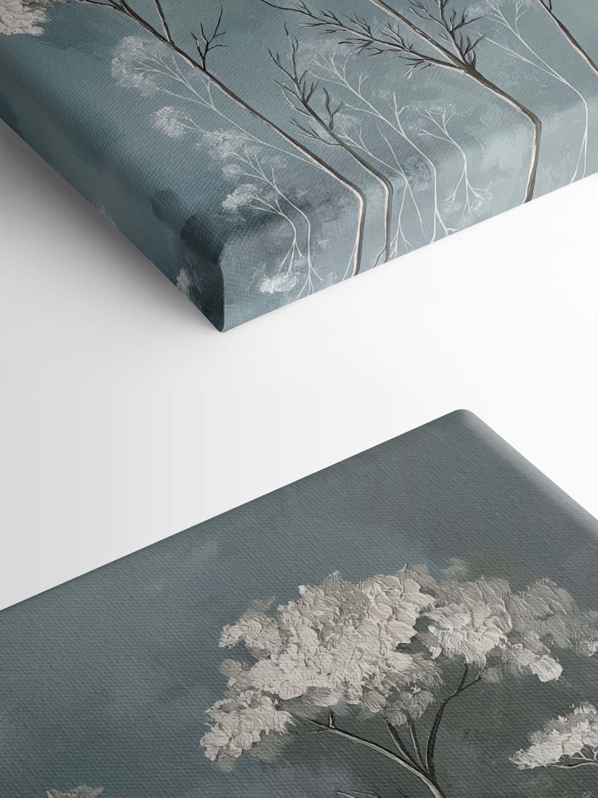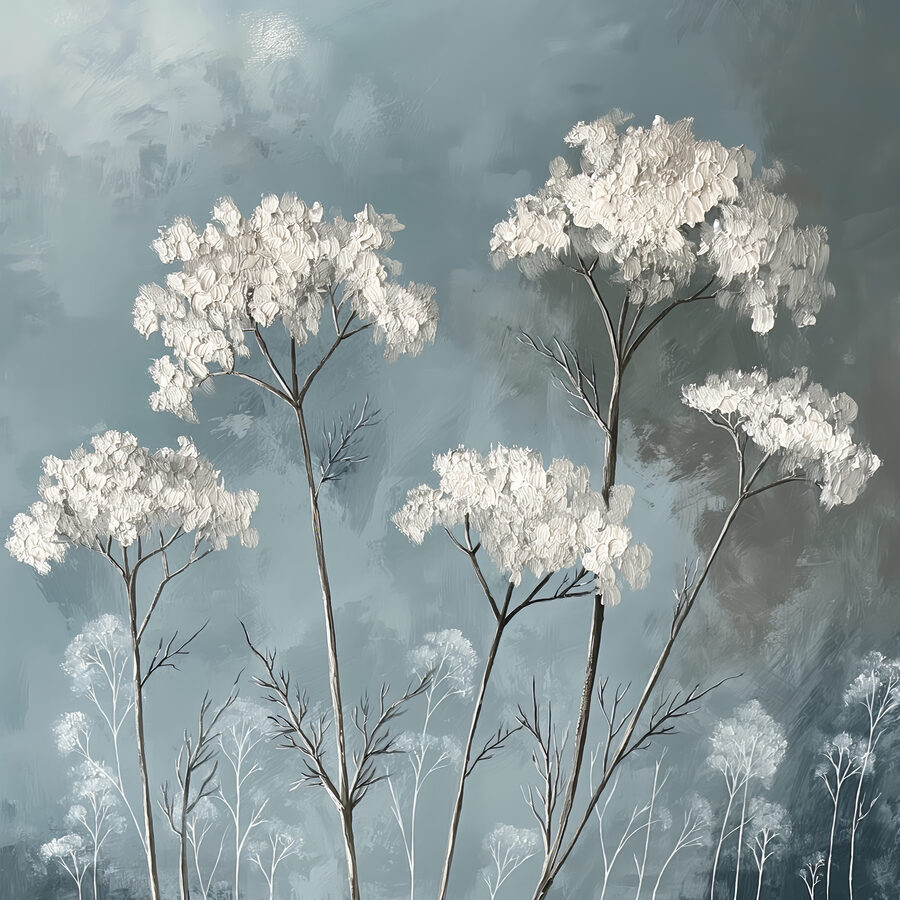 Verwandeln Sie Ihren Raum mit diesem bezaubernden Leinwanddruck mit zarten weißen Blumen vor einem beruhigenden blauen Hintergrund. Stellen Sie sich vor, wie diese zarten Blüten Ihre Wand schmücken und Ruhe in Ihr Zuhause flüstern. Sie sind wie ein Hauch frischer Luft, perfekt, um eine langweilige Ecke aufzuhellen oder Ihrem Wohnzimmer einen süßen Hauch von natürlichem Charme zu verleihen. Ihre Freunde werden es sicher bemerken, und vielleicht ertappen Sie sie sogar beim Träumen, während sie sich in ihrer heiteren Schönheit verlieren. Es ist mehr als nur Dekoration; es ist wie ein kleines Stückchen Frieden, das dort hängt und jeden Tag zum Lächeln einlädt.