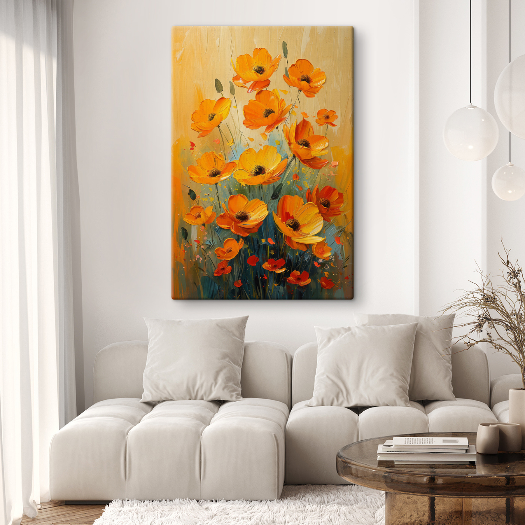 Dieser lebendige Leinwanddruck mit seinen farbenprächtigen Blumen bringt jeden Raum zum Strahlen! Stellen Sie sich vor, Sie betreten Ihren Raum und fühlen sich sofort von diesem fröhlichen Kunstwerk beflügelt – es ist wie eine Gartenparty für Ihre Wand. Die verspielten Blüten, orangefarbene und gelbe Spritzer vor einem sanften Hintergrund, verbreiten ein Gefühl von Wärme und Fröhlichkeit. Es ist perfekt für gemütliche Ecken oder um Freude in einem Arbeitsbereich zu verbreiten. Vielleicht ertappen Sie sich sogar dabei, wie Sie jedes Mal lächeln, wenn Sie vorbeigehen. Wer würde sich nicht gerne ein wenig vom Glück der Natur ins Haus holen? Es ist eine einfache Möglichkeit, frischen Wind in Ihre Einrichtung zu bringen!