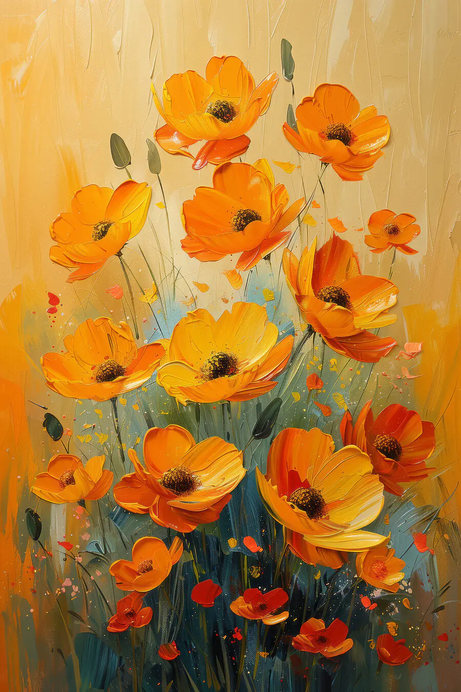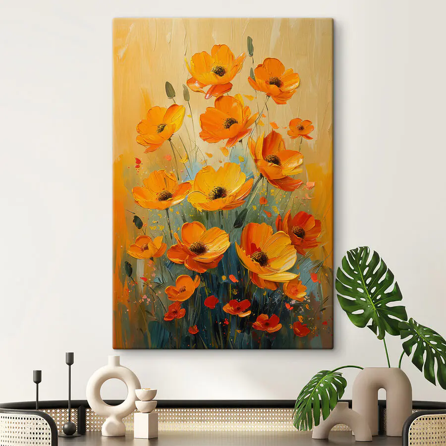 Dieser lebendige Leinwanddruck mit seinen farbenprächtigen Blumen bringt jeden Raum zum Strahlen! Stellen Sie sich vor, Sie betreten Ihren Raum und fühlen sich sofort von diesem fröhlichen Kunstwerk beflügelt – es ist wie eine Gartenparty für Ihre Wand. Die verspielten Blüten, orangefarbene und gelbe Spritzer vor einem sanften Hintergrund, verbreiten ein Gefühl von Wärme und Fröhlichkeit. Es ist perfekt für gemütliche Ecken oder um Freude in einem Arbeitsbereich zu verbreiten. Vielleicht ertappen Sie sich sogar dabei, wie Sie jedes Mal lächeln, wenn Sie vorbeigehen. Wer würde sich nicht gerne ein wenig vom Glück der Natur ins Haus holen? Es ist eine einfache Möglichkeit, frischen Wind in Ihre Einrichtung zu bringen!