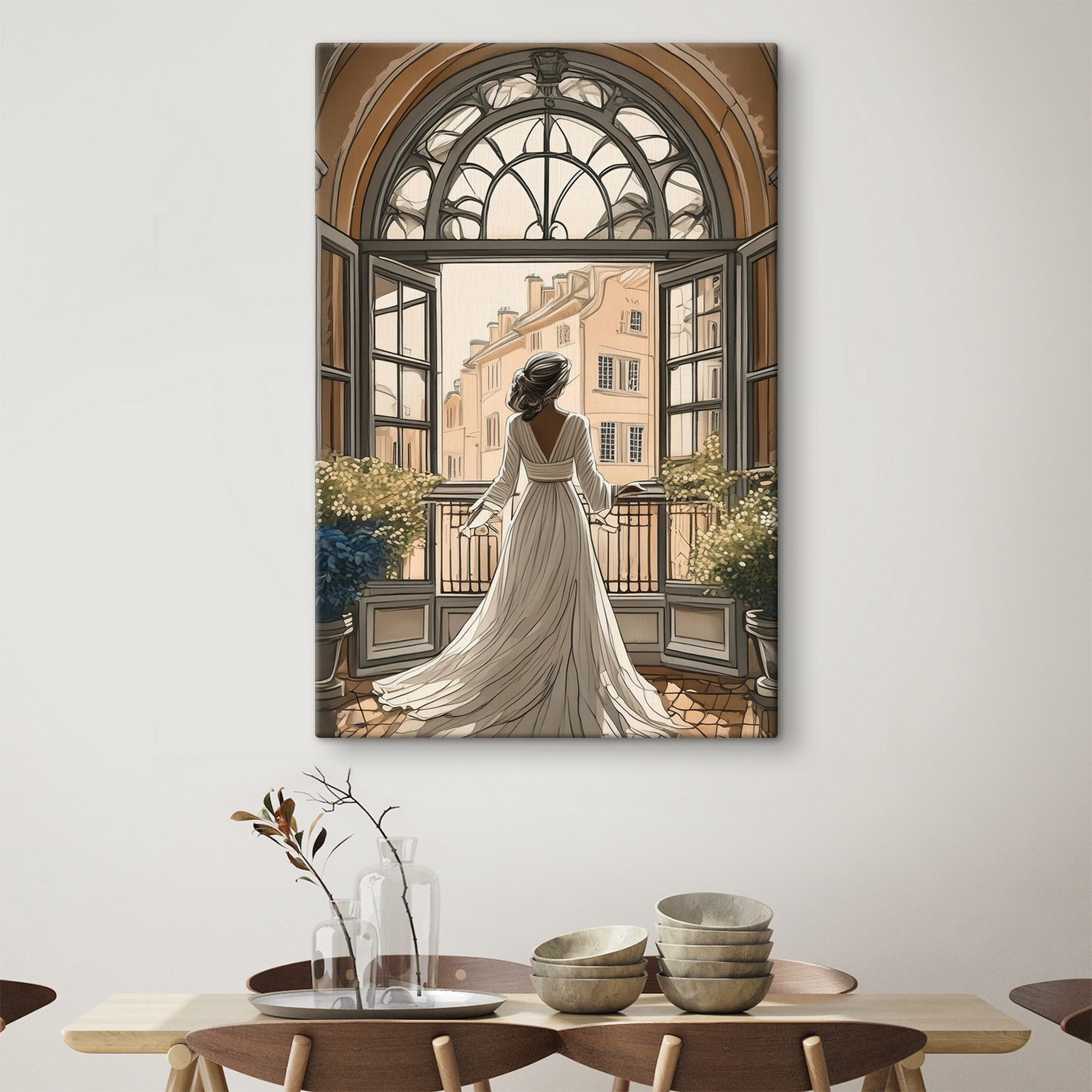 Haben Sie schon einmal davon geträumt, in einen zeitlosen Moment der Schönheit und Eleganz einzutauchen? Dieser Leinwanddruck mit der Bezeichnung “Wandbilder s39480” fängt genau das ein. Stellen Sie sich eine Frau vor, die elegant in ein fließendes Kleid gehüllt aus einem großen gewölbten Fenster blickt. Die Stadtlandschaft draußen mit ihren charmanten Gebäuden erzählt Geschichten von Romantik und Nostalgie. Die sanften Farbtöne und die raffinierten Details geben Ihnen das Gefühl, dass Sie direkt bei ihr sind, vielleicht an einem faulen Sonntagmorgen, und diese heitere Stimmung in sich aufnehmen.