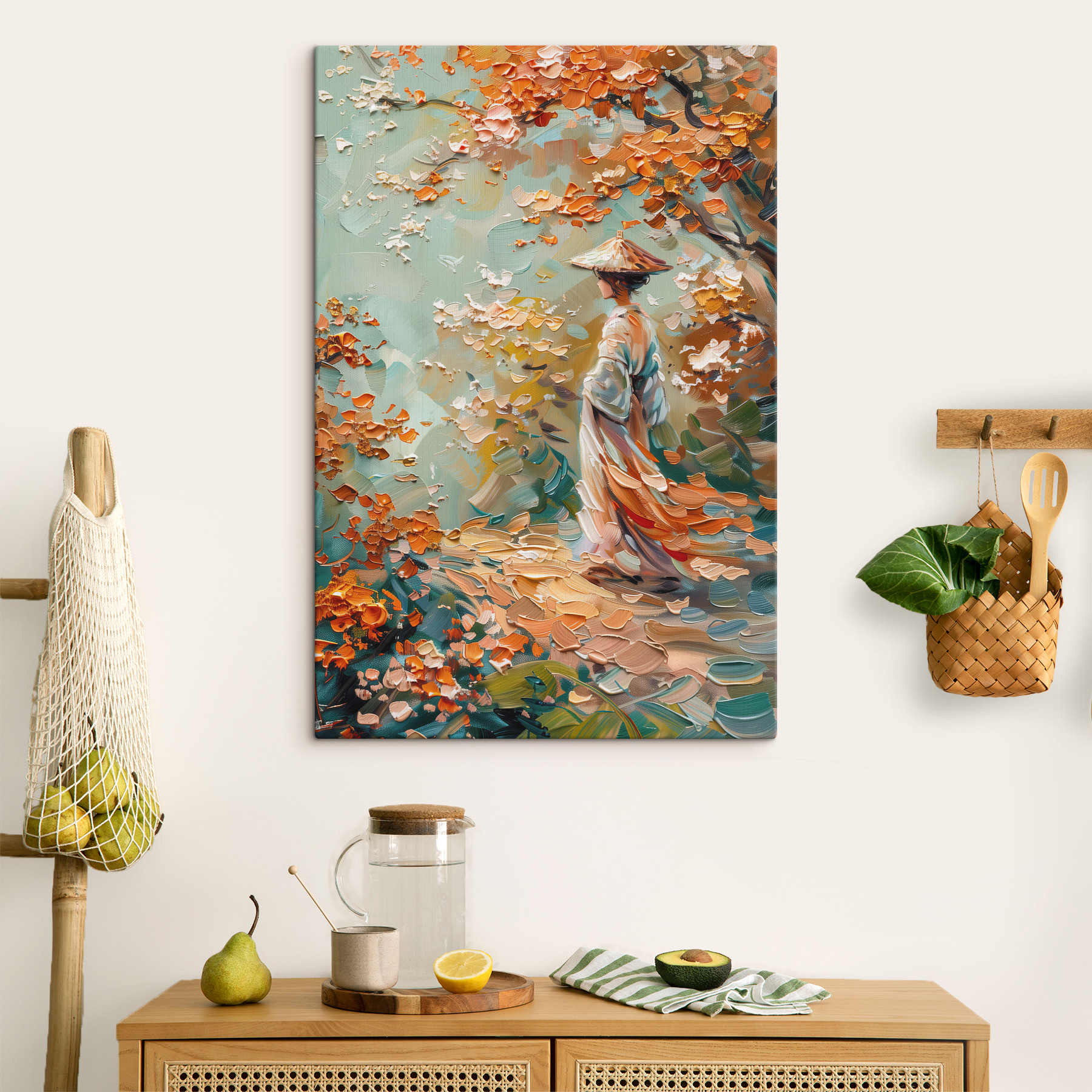 Versetzen Sie sich in einen heiteren Tagtraum mit diesem Leinwanddruck “Gemälde einer Frau, die in einem Park spazieren geht”. Stellen Sie sich vor, Sie werden in einen ruhigen Morgen entführt, an dem die Luft frisch ist und die Blätter unter Ihren Füßen knirschen. Die Farben sind wie eine warme Umarmung – kräftige Orangetöne gemischt mit kühlen Blautönen. Es ist, als wüsste diese Frau genau, wo sie Frieden finden kann. Es eignet sich perfekt für eine gemütliche Ecke oder den Raum, in dem du dich entspannst, denn es strahlt Ruhe und Neugierde zugleich aus. Hängen Sie es auf, und wer weiß? Vielleicht fühlen Sie sich dann ein bisschen entspannter und weniger wie ein Wirbelwind. Kunst, die atmet, im wahrsten Sinne des Wortes. Das ist ziemlich beliebt, wissen Sie.