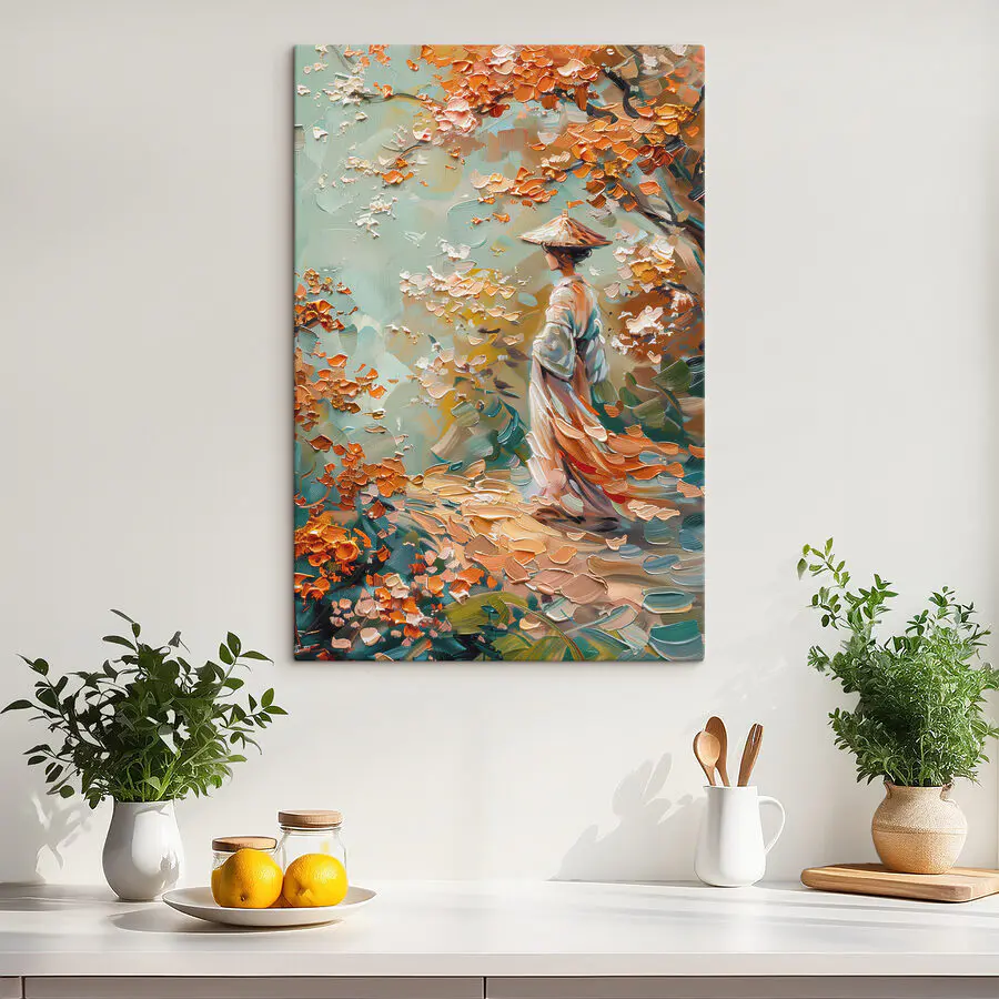 Versetzen Sie sich in einen heiteren Tagtraum mit diesem Leinwanddruck “Gemälde einer Frau, die in einem Park spazieren geht”. Stellen Sie sich vor, Sie werden in einen ruhigen Morgen entführt, an dem die Luft frisch ist und die Blätter unter Ihren Füßen knirschen. Die Farben sind wie eine warme Umarmung – kräftige Orangetöne gemischt mit kühlen Blautönen. Es ist, als wüsste diese Frau genau, wo sie Frieden finden kann. Es eignet sich perfekt für eine gemütliche Ecke oder den Raum, in dem du dich entspannst, denn es strahlt Ruhe und Neugierde zugleich aus. Hängen Sie es auf, und wer weiß? Vielleicht fühlen Sie sich dann ein bisschen entspannter und weniger wie ein Wirbelwind. Kunst, die atmet, im wahrsten Sinne des Wortes. Das ist ziemlich beliebt, wissen Sie.
