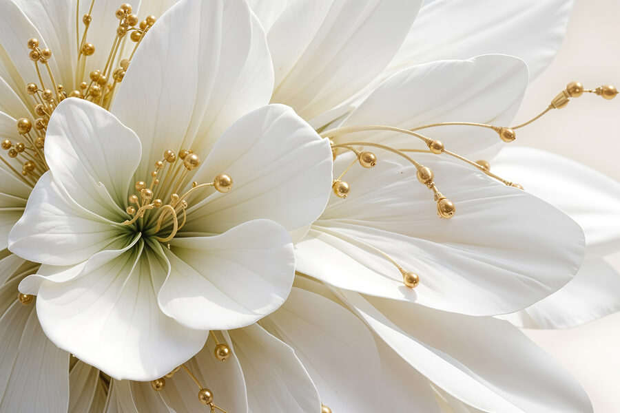 Stellen Sie sich vor, Sie betreten einen Raum, in dem Eleganz auf Natur trifft. Das “Wandbilder Elegance in White and Beads” macht genau das! Dieses atemberaubende Werk zeigt üppige weiße Blütenblätter, die direkt auf der Leinwand zu blühen scheinen und Sie in ihre heitere Schönheit ziehen. Es ist, als hätte man einen kleinen Garten im Haus, nur ohne Gießkanne.