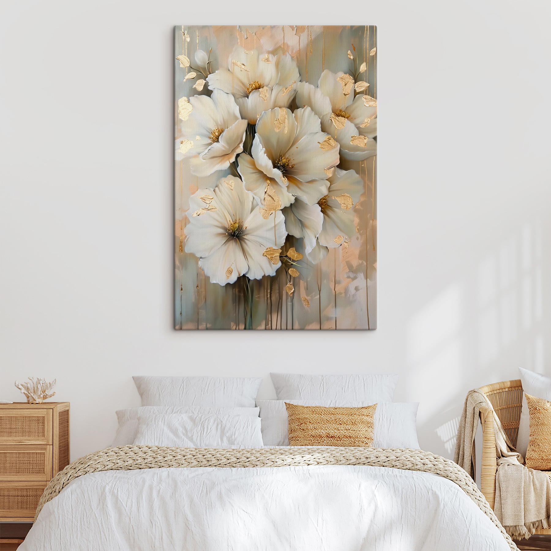 Treten Sie ein in eine Welt voller Eleganz mit diesem atemberaubenden Leinwanddruck mit verträumten Blumen. Es ist wie ein sanftes Morgenlicht, das in Ihren Raum fällt und Wärme und Gelassenheit einlädt. Stellen Sie sich vor, wie es über einer gemütlichen Couch hängt und jede zwanglose Zusammenkunft in einen besonderen Anlass verwandelt. Die sanften Farben und raffinierten Details ziehen die Blicke auf sich, ohne nach Aufmerksamkeit zu schreien. Es ist das perfekte Stück, das einem Raum Charakter verleiht und zu Gesprächen über Gärten und die Schönheit der Natur anregt. Stellen Sie sich vor, Sie schlürfen einen Tee und genießen dabei die sanfte Schönheit dieser Blüten. Es fühlt sich einfach wie zu Hause an.