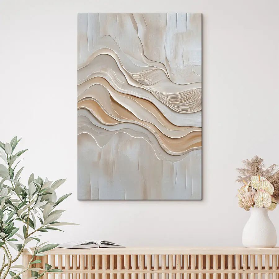 Verwandeln Sie jeden Raum mit diesen atemberaubenden Leinwanddrucken mit weichen weißen und braunen Wellenlinien, die eine ruhige und beruhigende Atmosphäre schaffen. Es ist, als ob man sich ein Stück heitere Natur ins Haus holt – perfekt für die gemütlichen Ecken, in denen ein gutes Buch auf einen wartet. Stellen Sie sich vor, wie Sie es sich mit einem warmen Getränk in der Hand gemütlich machen, während dieses Kunstwerk die Freude und die Fantasie anregt. Es strahlt subtile Eleganz aus und ist gleichzeitig ein lustiger Gesprächsanlass. Ob in einem minimalistischen Raum oder in einem lebhaften Ambiente, dieses Kunstwerk fügt alles mühelos zusammen und verleiht ihm einen Hauch von künstlerischem Flair. Wer würde das nicht wollen?