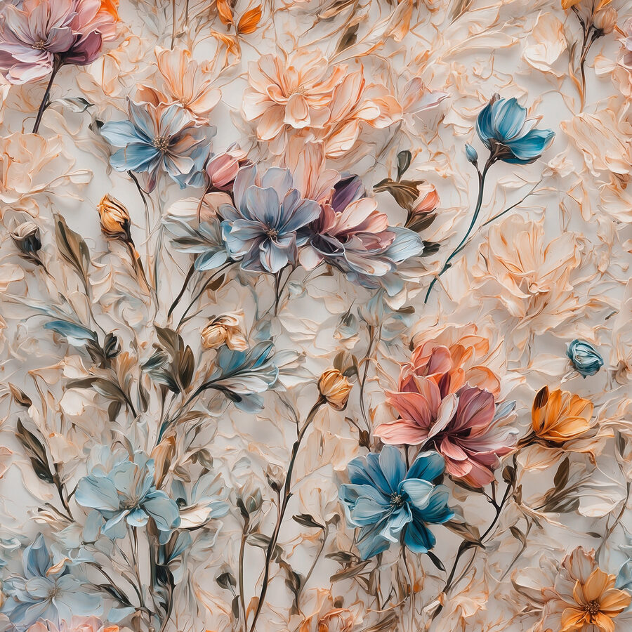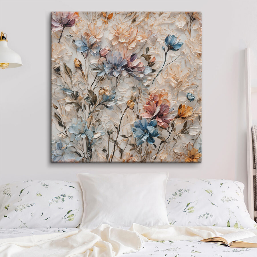 Ist dieser Leinwanddruck nicht einfach bezaubernd? Es ist eines dieser Stücke, die einen Raum sofort verwandeln können – im Ernst, es ist wie eine florale Explosion von Farbe und Textur. Mit einer schönen Mischung aus Pastellblau, zartem Rosa und warmen Orangetönen sieht es fast so aus, als würden die Blumen direkt von der Leinwand aufspringen.