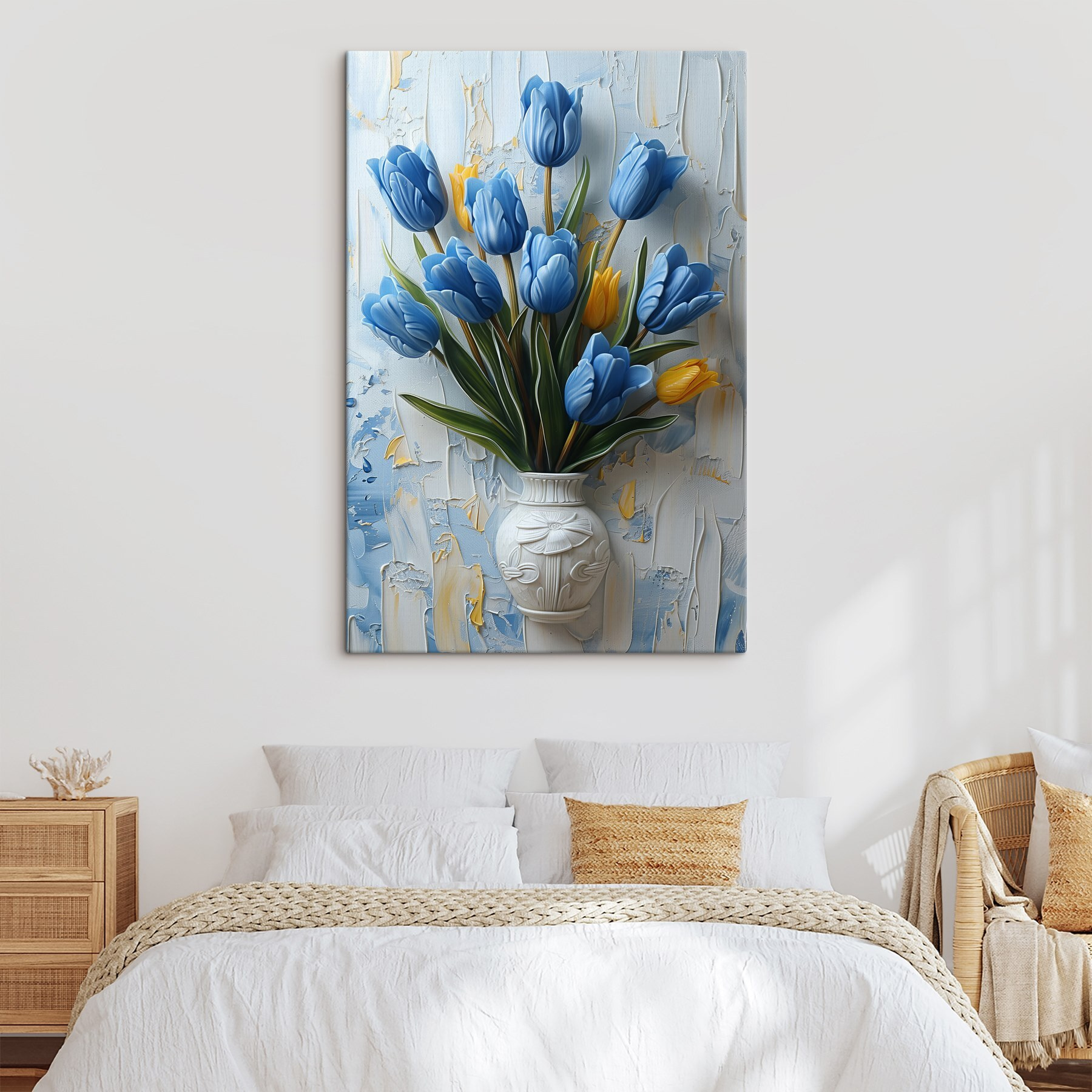 Dieser hübsche Leinwanddruck mit einer Vase voller blauer Tulpen bringt frischen Wind in jeden Raum. Es ist, als ob man sich den Frühling ins Haus holt, ohne dass man niesen muss. Die leuchtenden Farben heben sich von einem sanften Hintergrund ab und schaffen eine einladende Atmosphäre, die Herzen erwärmt. Stellen Sie sich dieses hübsche Kunstwerk in einer gemütlichen Ecke vor, wo es jedes Mal, wenn jemand vorbeikommt, Freude und Gespräche auslöst. Perfekt für alle, die Blumen zu schätzen wissen, aber vielleicht keinen grünen Daumen haben. Außerdem erinnert es daran, innezuhalten und an den Tulpen zu riechen – im übertragenen Sinne natürlich. Hängen Sie sie einfach auf und lassen Sie die guten Gefühle fließen!